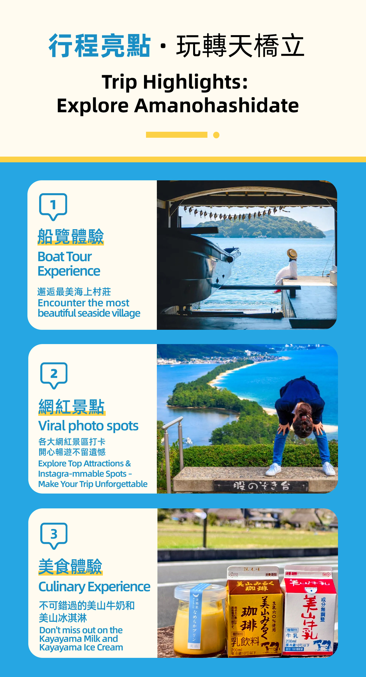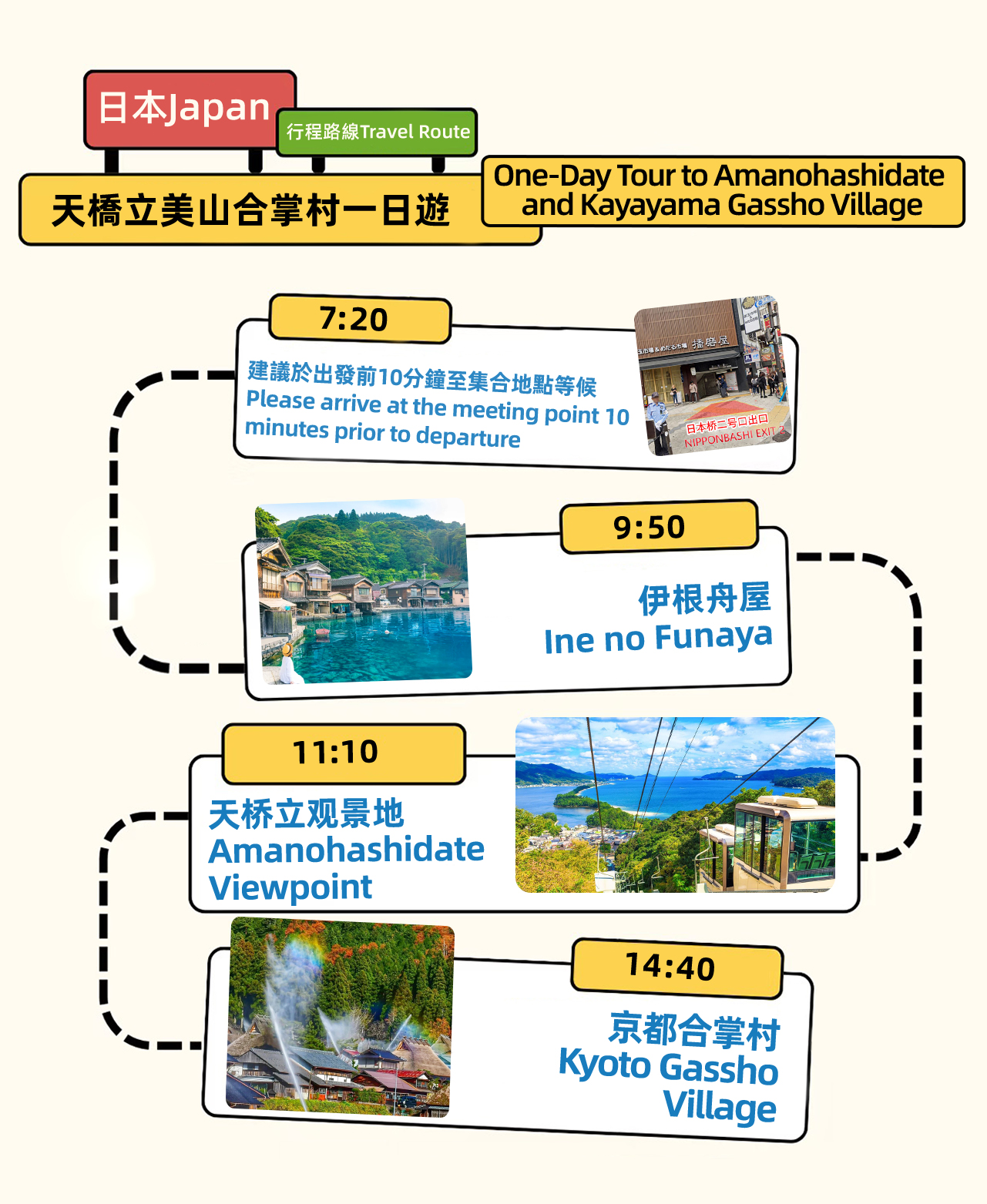 - ?아마노하시다테, 지온지 사원, 아마노하시다테 우산 공원, 초가 마을 등 유명 명소를 통과합니다.
