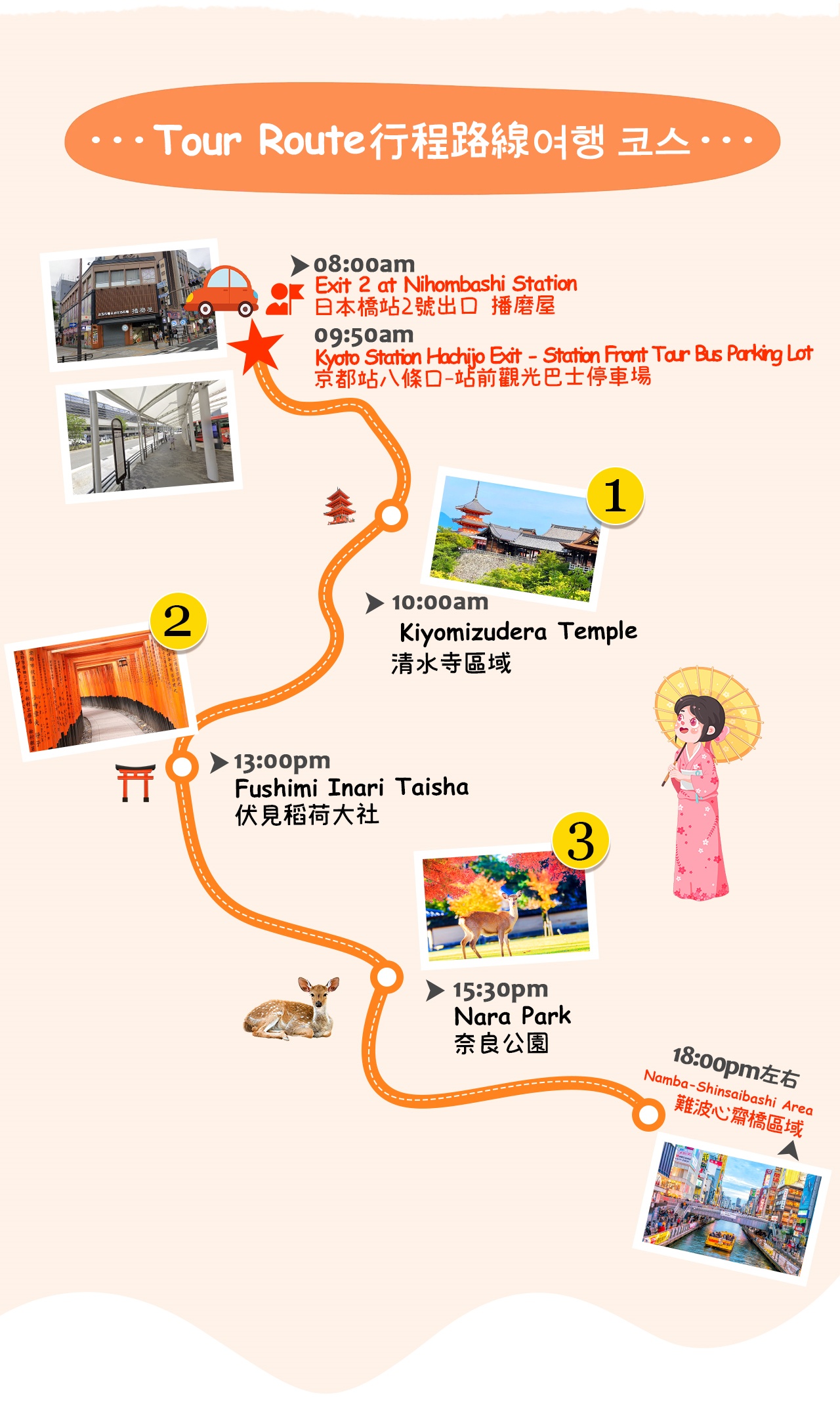 # 하차 장소는 오사카로 통일되며, 교토를 경유하지 않으니 특별히 유의하시기 바랍니다! # # 교토의 고도 풍경, 신사 문화와 나라의 자연미를 체험하며, 문화와 자연이 완벽하게 어우러진 여행입니다. * 기요미즈데라 지역에 들어서면 세계문화유산인 기요미즈데라와 지슈 신사가 오래된 종교의 매력을 선사합니다. 니넨자카, 산넨자카를 따라 천천히 걸으면 조약돌이 깔린 거리 양옆으로 오래된 일본식 건축물과 수공예품 가게가 있으며, 세이헤이 골목의 고요함은 마치 시간을 거슬러 올라간 듯한 느낌을 줍니다. 기모노로 갈아입고 거닐면 고풍스러운 거리로 살짝 발을 들여놓는 순간, 모든 사진이 그림에서 튀어나온 듯합니다