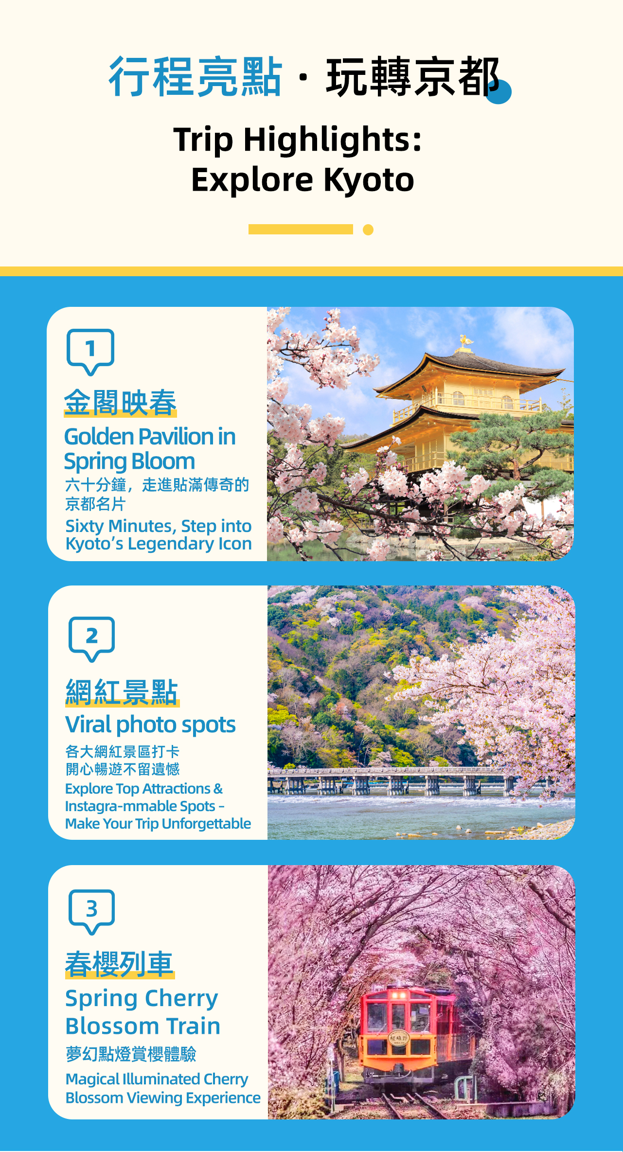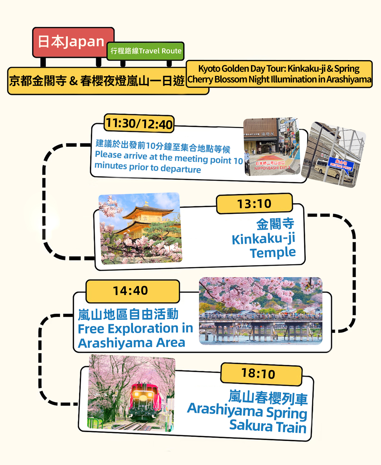 * 출발 전 안내: 출발 전날, 대략 18:00~21:00 사이에 상세한 가이드 및 차량 정보를 이메일로 보내드릴 예정이오니 반드시 확인해 주시기 바랍니다. 메일이 스팸 메일로 분류될 수 있으니 주의해서 확인해 주세요. 성수기에는 메일 발송 시간이 다소 지연될 수 있는 점 양해 부탁드립니다. 특수한 사정으로 여러 통의 메일을 받으신 경우, 마지막 메일을 기준으로 해 주십시오. 이해와 협조에 감사드립니다! * **금각사** 교토의 세계문화유산 명소입니다. 3층 누각 전체가 찬란한 금박으로 덮여 있으며, 봄날 맑은 하늘 아래 거울 연못의 푸른 물결에 비칩니다. 분홍빛 벚꽃이 연못가를 둘러싸고, 고찰의 금빛 그림자와 지는 꽃잎이 겹쳐져 마치 흐르는 듯한 천년의 우키요에 같습니다. * **아라시야마 지역** **덴류지** 세계문화유산 중 하나로, 교토 선(禪) 정원의 정점을 보여줍니다. '조겐치 정원'은 아라시야마와 벚꽃을 배경으로 자연 산수와 고산수 예술을 완벽하게 융합했습니다. 벚꽃 시즌에는 정원 내 수양벚꽃과 단풍나무의 푸른 잎이 어우러져 방장(方丈) 툇마루에 앉아 연못에 비치는 모습을 조용히 감상하면 '발걸음을 옮길 때마다 경치가 바뀌고, 나무 한 그루, 꽃 한 송이마다 선의 기운이 느껴지는' 고요한 미학을 경험할 수 있습니다. **아라시야마 대나무 숲길** 총 길이 약 400m의 녹색 터널은 아라시야마에서 가장 선(禪)적인 산책로입니다. 양쪽으로 곧게 뻗은 맹종죽이 하늘을 가릴 듯이 솟아 있고, 햇빛이 대나무 잎을 통해 쏟아져 얼룩덜룩한 그림자를 드리웁니다. 바람이 대나무 숲을 스칠 때 나는 사각거리는 소리는 "일본에서 보존할 가치가 있는 100가지 소리" 중 하나로 꼽힙니다. **노노미야 신사** 대나무 숲길 깊숙한 곳에 숨겨진 소박한 신사로, 검은 나무 도리이(鳥居), 소박한 초가지붕으로 헤이안 시대의 고아한 형태를 유지하고 있습니다. 신사는 좋은 인연, 학업 성취에 영험하다고 알려져 있으며, 봄에는 신사 내 수양벚꽃이 처마를 가볍게 스치며 어두운색 건물과 어우러져 고요하고 신성한 풍경을 연출합니
