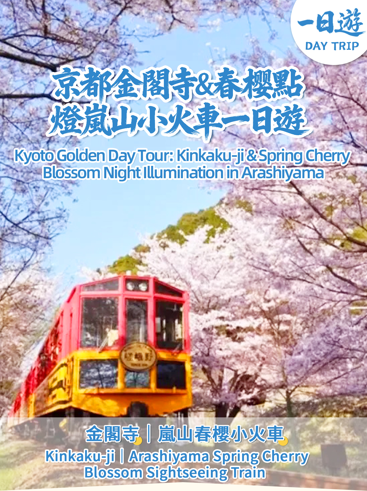[교토] 【벚꽃 시즌 추천】 교토 금각사와 아라시야마 소형 열차 벚꽃 감상 야간 한정 열차 일일 투어 (아라시야마 소형 열차 티켓 포함 오사카/교토 출발)