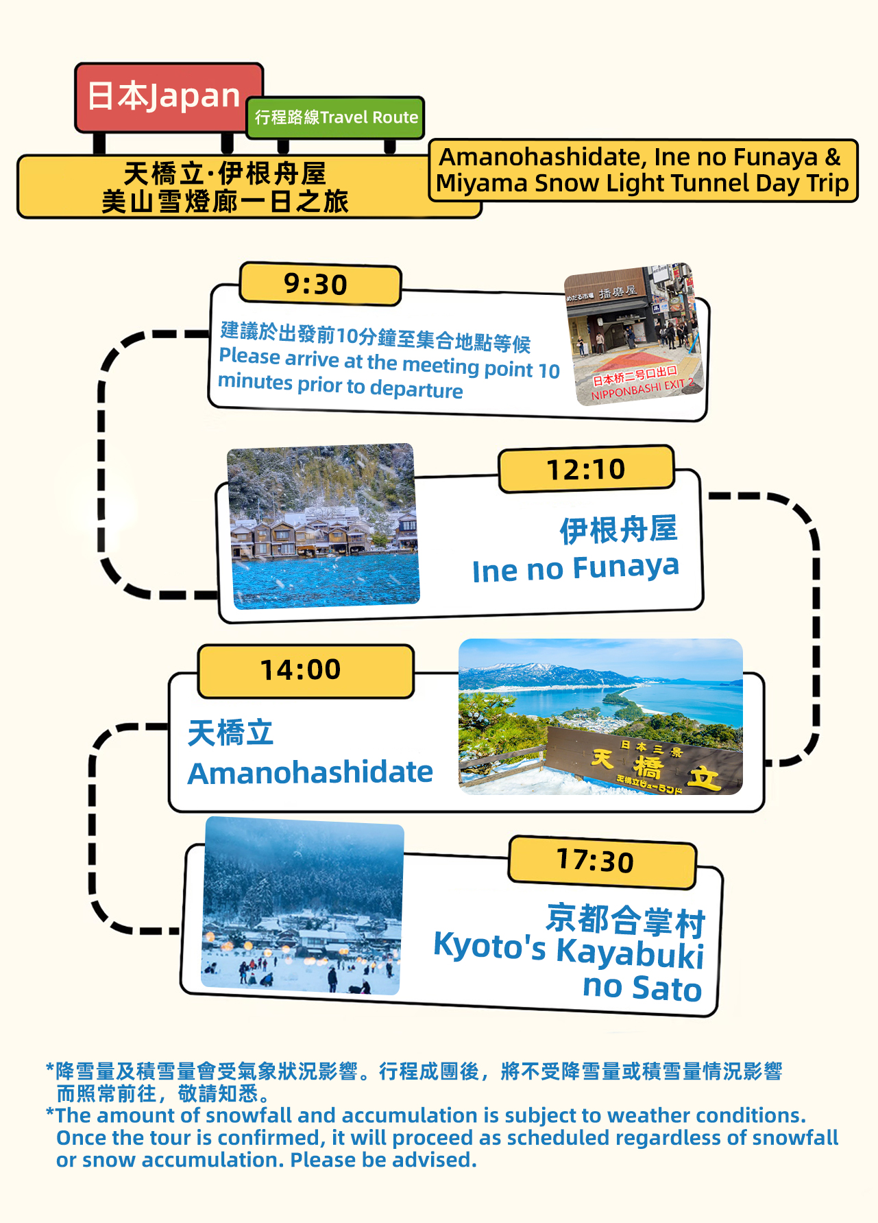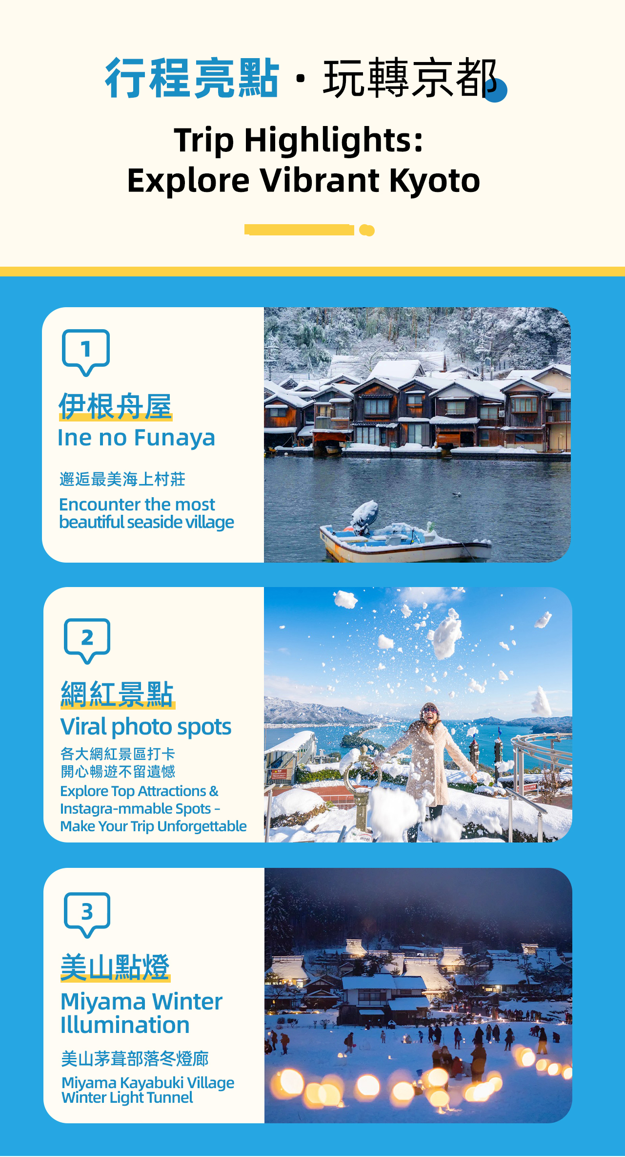 - 첫 번째 코스: 이네 후나야 - 이네쵸는 일본인들이 일본에서 가장 아름다운 마을 18곳 중 하나로 평가했으며, 일본에서 유일무이한 수상 가옥 건축물이 있어 관광 명소에서는 경험할 수 없는 자연 그대로의 풍경을 체험할 수 있습니다. - 두 번째 코스: 아마노하시다테 전망대는 일본 삼경 중 하나입니다. 크고 작은 약 8,000그루의 소나무가 있으며, 동서 양쪽은 흰색 백사장으로 이루어져 특별한 자연 경관을 자랑합니다. 그 모습이 마치 하늘로 비스듬히 뻗어 나가는 다리와 같아 '아마노하시다테'라는 이름이 붙었습니다. 이곳에는 전망 케이블카도 있습니다. 아마노하시다테 전망대. - 세 번째 코스: 교토 갓쇼무라 - 미야마 가야부키 취락, 미야마 겨울 동등롱 점등 행사: (행사 기간: 1월 19일 - 1월 23일) 초가 지붕 마을 점등 행사 - 설등롱, 꽃등롱 약 78개, LED 등롱 약 200개, 제등 약 50개 등 다양한 등롱을 밝혀 밤의 초가 지붕 마을에 빛을 더합니다. 일본 겨울의 독특한 매력을 함께 느껴보시길 진심으로 초대합니다.