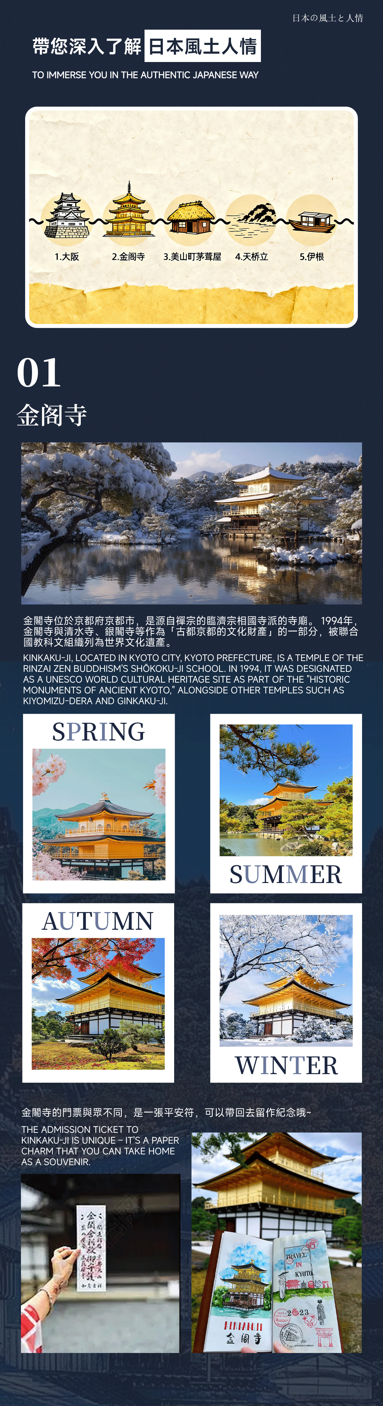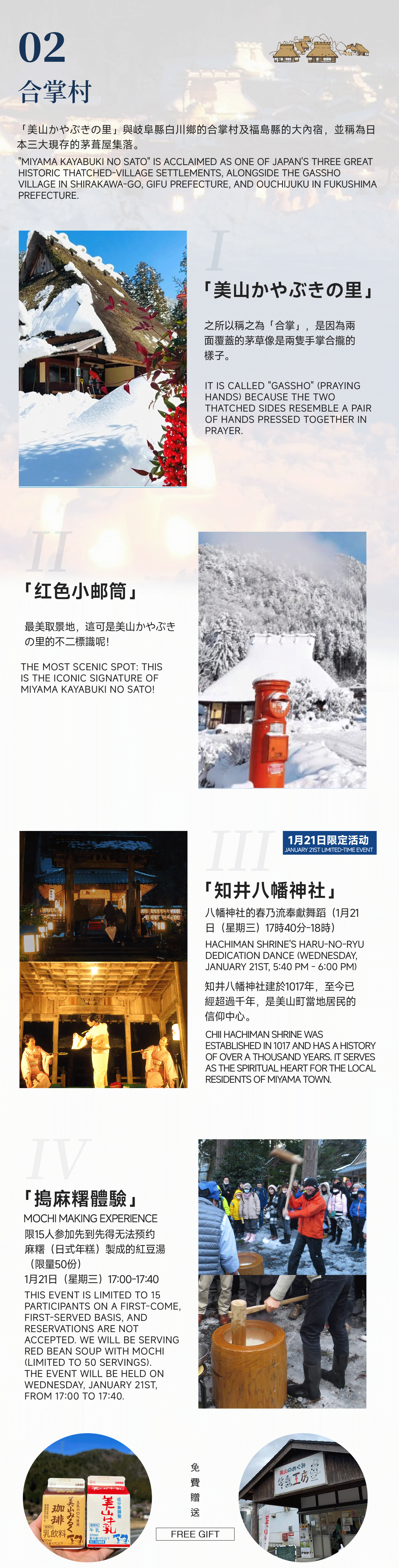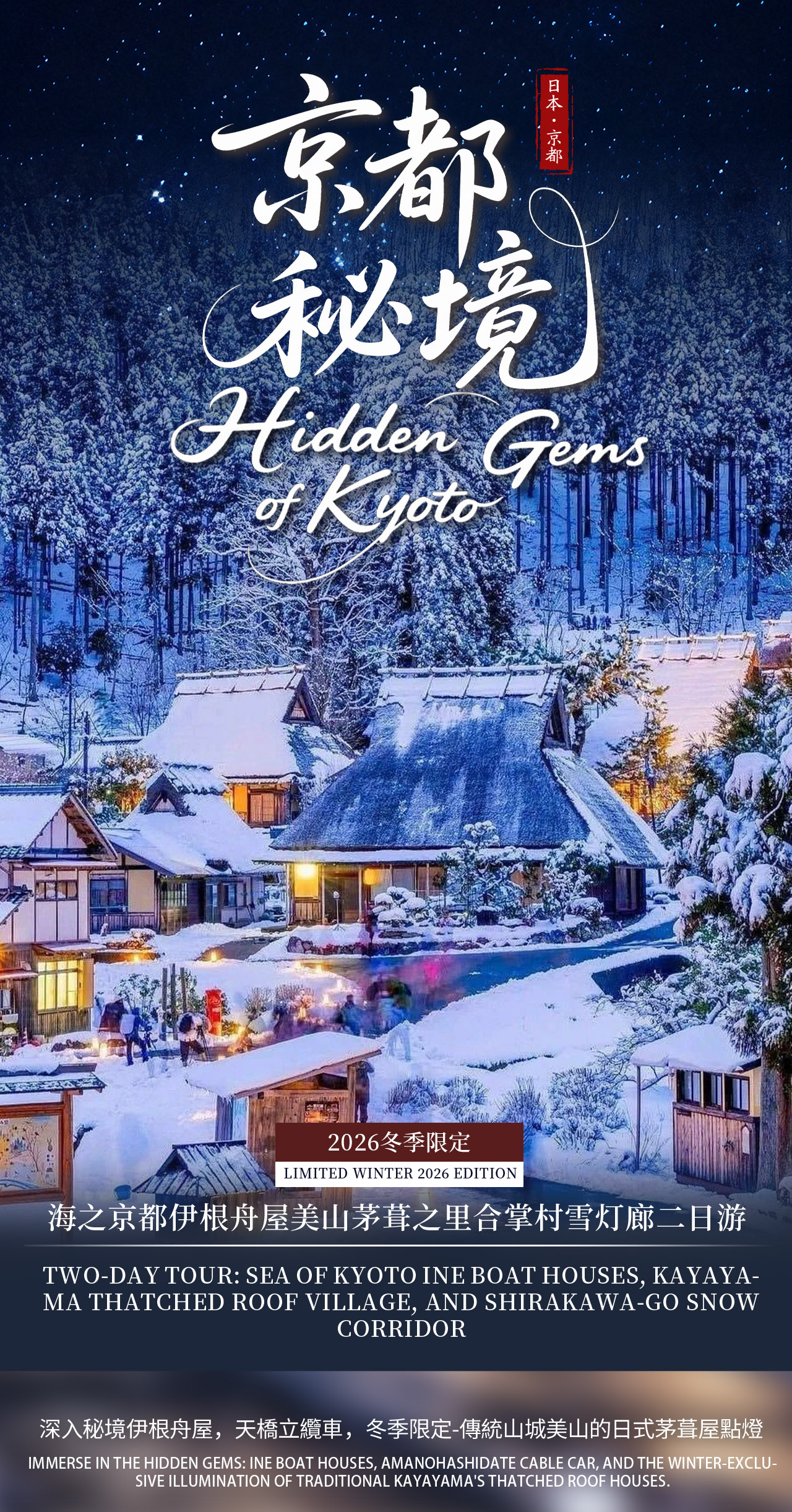 【첫째 날】 금각사 & 미야마 설등랑 → 교토 숙박 오사카 또는 교토에서 출발하여 세계문화유산인 금각사로 향합니다. 겨울에는 은백색 설경이 정원을 덮고 금각이 호수에 비쳐 마치 일본 화권과 같이 고요하고 아름답습니다. 이어서 미야마 가야부키노사토로 이동하여 겨울 한정인 설등랑 점등을 체험합니다. 눈이 지붕과 작은 길을 덮고 수많은 등불이 고촌을 비추며 밥 짓는 연기가 피어오르는 모습이 마치 동화 속 세계와 같습니다. 밤에는 포장마차에서 따뜻한 사슴고기 꼬치, 따뜻한 미야마 우유 등 현지 겨울 간식을 맛볼 수도 있습니다. 저녁에는 교토 시내 호텔에 투숙하여 편안하게 휴식을 취하며 다음 날의 설경 여행을 준비합니다. 【둘째 날】 아마노하시다테 → 이네 후나야 & 이네만 유람선 → 오사카/교토 귀환 이른 아침, 일본 삼경 중 하나인 아마노하시다테로 출발합니다. 가사마쓰 공원 전망대에 올라 길이 약 3.6km의 소나무 숲 사주가 미야즈 만에 가로놓인 모습을 굽어봅니다. 겨울, 눈 덮인 소나무 가지와 푸른 바다는 마치 하늘로 이어지는 은빛 다리처럼 고요하고 몽환적인 풍경을 자아냅니다. 다음으로 이네 후나야로 향합니다. 에도 시대 해상 민가가 물가에 지어져 겨울에는 지붕에 눈이 덮이고 바다가 빛을 발하며 고요한 그림 같습니다. 이네만 유람선을 타고 후나야 마을과 겨울 해안 경치를 가까이에서 감상하며 고대 어촌의 독특한 매력을 느껴보세요. 오후에 일정을 마치고 편안한 버스를 타고 오사카 또는 교토로 돌아가 겨울의 아름다운 경치와 잊지 못할 경험으로 여행을 마무리합니다. ※ 주의사항: 현지의 강설 및 적설 상황은 기후에 따라 다릅니다. 투어는 일단 출발이 확정되면 강설량 부족 또는 적설 상황에 관계없이 정상적으로 출발하며 취소되지 않으니 양해 바랍니다.