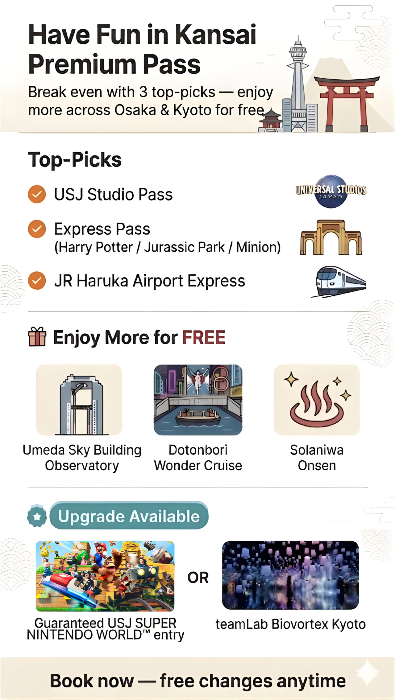 - * **다양한 프리미엄 옵션:** 유니버설 스튜디오 재팬, 1일 JR 간사이 패스, 교토 시티투어 버스 티켓 등 다양한 옵션 중 선택할 수 있어요.