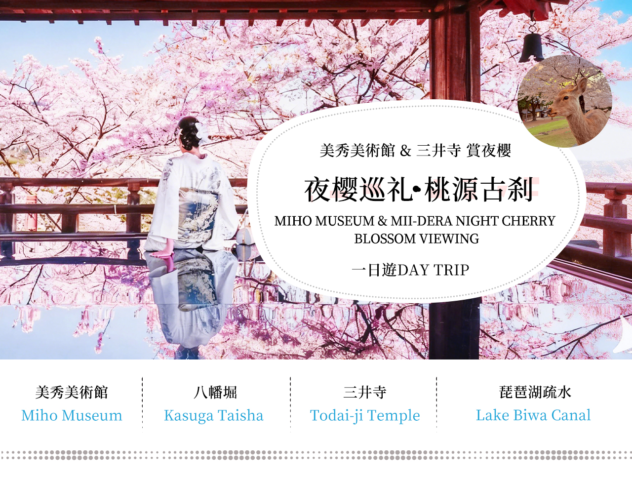 친애하는 친구 여러분, 봄의 일본은 벚꽃에서 가장 매혹적인 순간이 시작됩니다. 본 여행은 오사카에서 출발하여 시가와 교토 주변의 가장 대표적인 벚꽃 명소를 엄선하여 하루 만에 예술, 아름다운 경치, 야간 벚꽃의 완벽한 조화를 경험할 수 있도록 합니다. 첫 번째 목적지는 '현실판 도화원'이라고 불리는 미호 뮤지엄입니다. 터널과 다리를 지나면 산과 벚꽃으로 둘러싸인 미술관 건축물이 눈에 들어옵니다. 봄에만 볼 수 있는 한정적인 경치는 매우 고요하고 매혹적이며 사진작가와 예술 애호가들이 반드시 방문해야 할 곳입니다. 다음으로 벚꽃 명소인 미이데라로 이동합니다. 밤이 되면 불빛이 천년 고찰을 밝히고 벚꽃은 밤하늘 아래 낮과는 다른 몽환적인 분위기를 자아냅니다. 저녁에는 비와호 소수이를 거닐며 벚꽃이 수로를 따라 피어나고 호수, 벚꽃, 봄바람이 어우러져 이 봄날의 여정에 가장 낭만적인 마침표를 찍습니다. 팁: ※벚꽃 개화 상황에 따라 점등 기간이 변경될 수 있습니다. 벚꽃 감상은 자연 경관이 주를 이루며 구체적인 개화 상황은 날씨에 따라 달라집니다.