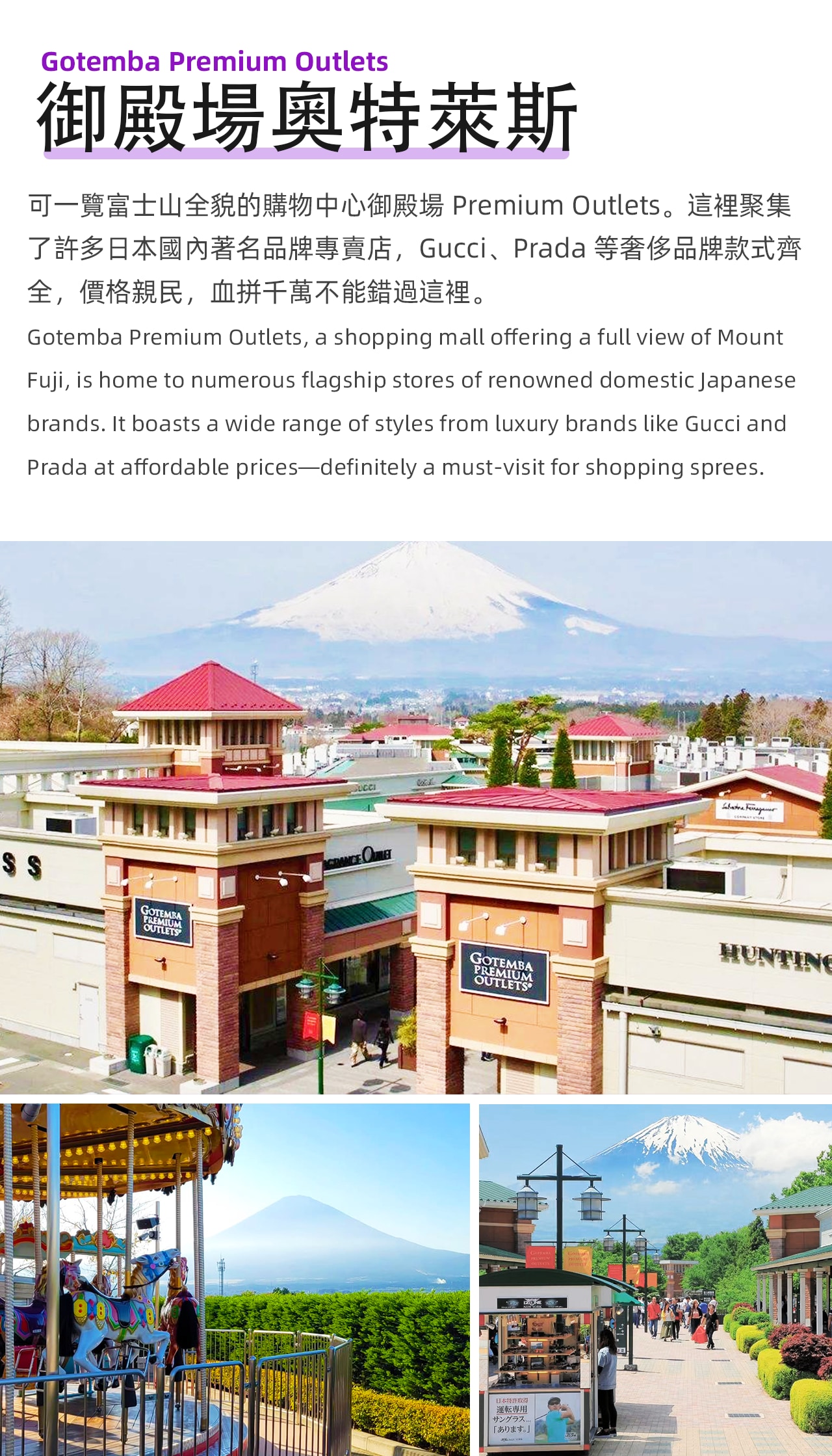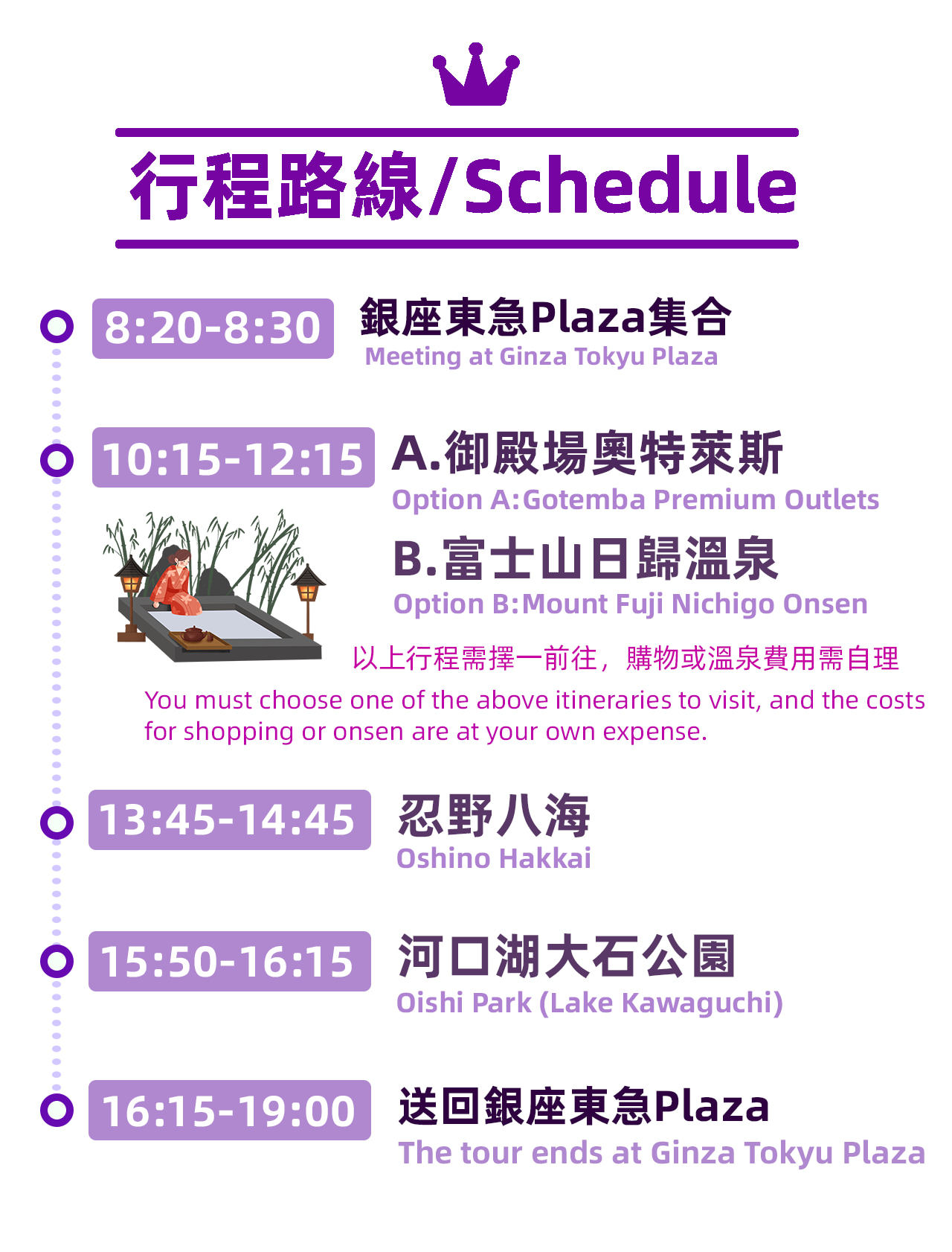 번잡한 도시를 잠시 벗어나 후지산 주변의 치유 풍경으로 떠나고 싶으신가요? 이 전용 버스 투어는 하루 만에 고텐바 프리미엄 아울렛, 오시노핫카이 등 핵심 명소를 연결하여 쇼핑의 즐거움부터 고대 마을 탐방, 호수 전망 감상까지, 편안하고 편리하게 후지산의 다채로운 매력을 만끽할 수 있도록 해드립니다. 하루의 시작은 편안한 관광버스가 정시에 **고텐바 프리미엄 아울렛**을 향해 출발합니다. 이곳은 쇼핑을 좋아하는 사람들의 천국으로, 수많은 국제 브랜드와 일본 특색 상점이 모여 있으며, 넓은 쇼핑 거리와 멀리 희미하게 보이는 후지산의 경치가 어우러져 쇼핑을 즐기면서 아름다운 풍경도 감상할 수 있습니다. 아울렛을 떠나 버스는 '일본의 구채구'라고 불리는 **오시노핫카이**로 향합니다. 이 천 년 고대 마을은 8개의 맑은 용천으로 둘러싸여 있으며, 샘물은 후지산의 눈이 녹아 만들어져 물맛이 맑고 달콤합니다. 오후에는 버스가 **가와구치코 인싸템 편의점**에 도착합니다. 이 편의점은 후지산과 점포 간판을 함께 담을 수 있어 인기를 얻었으며, 유리문을 열고 고개를 들면 웅장한 후지산이 푸른 하늘 아래 우뚝 솟아 있는 것을 볼 수 있습니다. 여행의 마지막 목적지는 가와구치 호숫가의 **오이시 공원**입니다. 이곳은 후지산과 가와구치 호수를 함께 감상하기에 가장 좋은 곳으로, 공원 내 벚꽃나무(봄), 단풍(가을)과 후지산이 어우러져 상징적인 '후지산, 가와구치 호수, 벚꽃/단풍' 조합이 절경을 이룹니다. 전 일정 편안한 버스 픽업 서비스, 전문 가이드의 친절한 안내, 여유로운 일정으로 교통과 노선 걱정 없이 쇼핑, 고대 마을, 인싸템 명소, 호수 풍경을 하루 만에 둘러보며 후지산 주변의 독특한 매력을 만끽할 수 있는 편안하고 즐거운 버스 투어를 지금 바로 시작하세요!