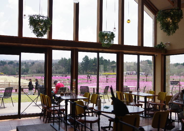 레스토랑 내부에서는 높은 천장과 식물적 분위기가 고요한 식사 경험을 만들어내며, 유리벽을 통해 보이는 분홍색 꽃잔디 전망이 이를 보완한다.