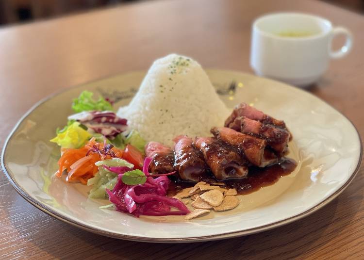2,800엔의 "컬러풀 로스트 비프 플레이트"는 눈과 배 모두를 위한 잔치로, 후지산 모양의 밥 언덕을 둘러싼 두꺼운 로스트 비프 슬라이스와 함께 다채로운 샐러드와 브로콜리 수프가 균형 잡힌 영양을 위해 곁들여진다.