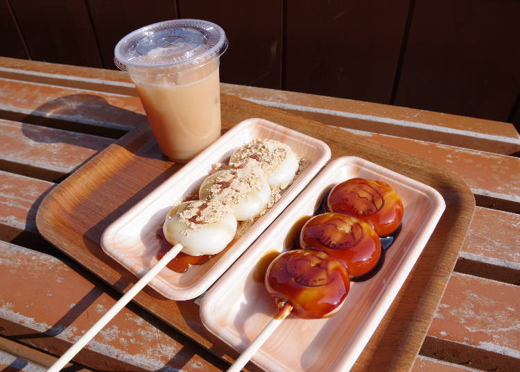 다누키 단고는 전통적인 미타라시 경단이고, 우사기 단고는 구로미쓰(흑설탕)와 기나코가 들어있다. 각각 400엔에 판매되며 아름다운 후지 전망을 계속 감상하면서 먹기 좋은 간식이다!