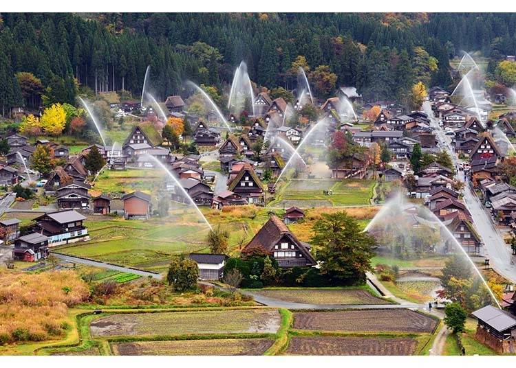 담배 꽁초를 버리거나 불꽃놀이는 절대로 해서는 안 됩니다. 갓쇼즈쿠리 가옥의 초가 지붕은 불에 매우 약해서, 한번 불이 붙으면 마을 전체로 번져 주민들이 소중하게 지켜 온 가옥이 소실될 우려가 있습니다. 이 때문에 화기 사용은 엄격하게 금지되어 있습니다.