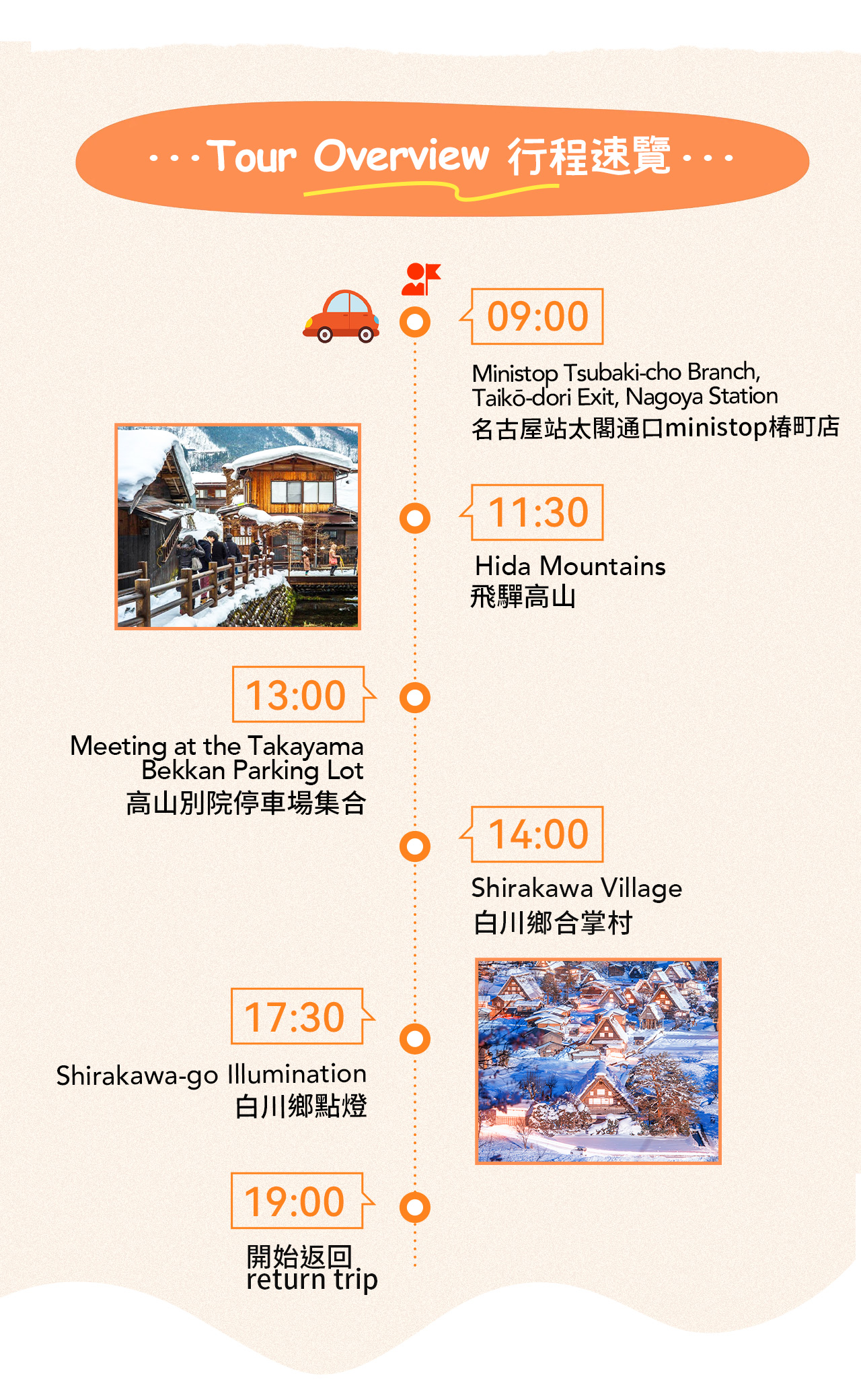 # Hida Takayama and Shirakawa-go in winter are the kind of places that feel like stepping into a fairytale filter. # Please be aware: This activity does not include access to the observation deck; the Shirakawa-go Light-Up Festival is only open for 4 days a year, so don't miss it or you'll have to wait another year~ * The tour starts from **Hida Takayama Old Town (if there is traffic congestion, the tour time may be shortened or the Takayama attraction tour may be canceled)**——This place retains traces of life from the Edo, Meiji, and Taisho periods. The streets are surrounded by wooden houses, sake breweries, and long-established shops. Every shot you take will be a retro-style Japanese street scene. You can freely explore during lunchtime. The Takayama ramen, Hida beef dishes, and desserts in the small shops are all very photogenic and delicious. It's like embodying the concept of "slow living", allowing you to be quietly healed by time as you stroll. * On the way from Takayama (**if you choose to travel