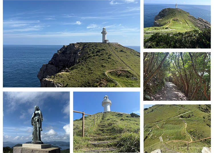 오니다케 산을 즐긴 다음에는 고토시를 대표하는 또 하나의 절경, 오세자키 등대로 향합니다. 후쿠에 시내에서 차로 약 1시간을 달리면 후쿠에지마 섬의 가장 서쪽에 있는 '오세자키 등대' 전망대에 도착합니다. 바다로 튀어나온 절벽 위에 우뚝 선 하얀 등대는 푸른 바다와 아름다운 대비를 이루는데, 잠시 시간을 내려 놓고 그 풍경을 바라보고 싶어집니다. 등대까지 가고 싶다면 주차장에 차를 세우고 걸어서 가야 합니다. 전망대 주차장에서 등대까지는 깎아 세운 듯한 절벽 위에 정비된 산책로를 따라 도보로 약 20분 정도를 내려가야 합니다. 고지대에 세워진 등대는 멀리 떨어진 전망대에서 보는 것보다 훨씬 거대하고 웅장한 모습을 하고 있어 바라보는 것만으로도 압도되어 버립니다. 바다로 튀어나온 곶에서 바라보는 경치는 그야말로 절경입니다. 앞을 가로막는 것 없이 확 트인 바다가, 서쪽 멀리 중국 대륙까지 이어져 있다고 생각하면 그 옛날 이곳에서 중국으로 향하는 배를 탔던 사람들의 불안과 새로운 땅을 향한 희망이 뒤섞인 묘한 감정을 느낄 수 있습니다. 꼭 등대로 와서 이 멋진 경치를 즐겨 보세요. 다만 주의할 점은 돌아오는 길이 오르막이라서 40분 정도 걸어야 한다는 것입니다. 등대까지 왕복하는 시간과 관광하는 시간을 합쳐 약 1시간 정도 소요됩니다. 시간적 여유가 없거나 체력에 자신이 없는 분은 '기도의 여신상'이 있는 전망대를 이용하는 것을 추천합니다. 서쪽을 바라보면 오세자키 등대와 광활한 바다를 내려다볼 수 있고, 동쪽으로는 후쿠에지마 섬의 복잡한 만과 기복이 많은 산들의 풍경이 펼쳐집니다. 특히 저녁 무렵에 전망대에서 바라보는 백색 등대와 바닷속으로 잠겨가는 석양은 말로 표현할 수 없을 정도로 아름답습니다.