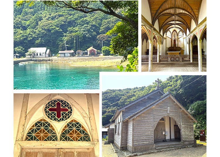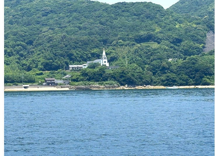 '나루시마 섬의 에가미 마을'이 있는 나루시마 섬은 후쿠에항 페리 터미널에서 고속선으로 30분이면 도착합니다. 에가미 마을 역시 잠복 기리시탄이 살았던 지역으로, 지금은 터널을 이용해 쉽게 갈 수 있지만 예전에는 차를 타고서는 쉽게 갈 수 없었습니다. 에가미 마을에서 가장 주목할 볼거리는 에가미 천주당으로, 그리스도교가 허용된 후 신자들이 샛줄멸을 잡아 모은 돈으로 지어졌습니다. 크림색 외벽과 하늘색 창틀이 포인트로, 요즘은 보기 드문 소박한 목조 건축 교회입니다. 자신들의 신앙이 인정받았다는 신자들의 기쁨과 '잠복'이 끝을 맞이했음을 상징하는 건물입니다.