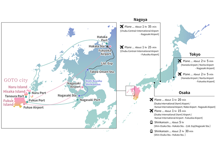고토시는 아시아 대륙과 매우 가까운 곳에 있습니다. 고토시에서 도쿄까지는 약 1,000km로 이는 고토시에서 대만까지의 거리와 거의 같습니다. 또 고토시에서 오사카, 교토까지는 약 650km로 고토시에서 중국 상하이까지의 거리와 거의 비슷합니다. 제주도나 한반도 남단과도 가까워 예로부터 일본의 해상 관문으로서 외국과의 교류에서 중요한 역할을 해왔습니다.