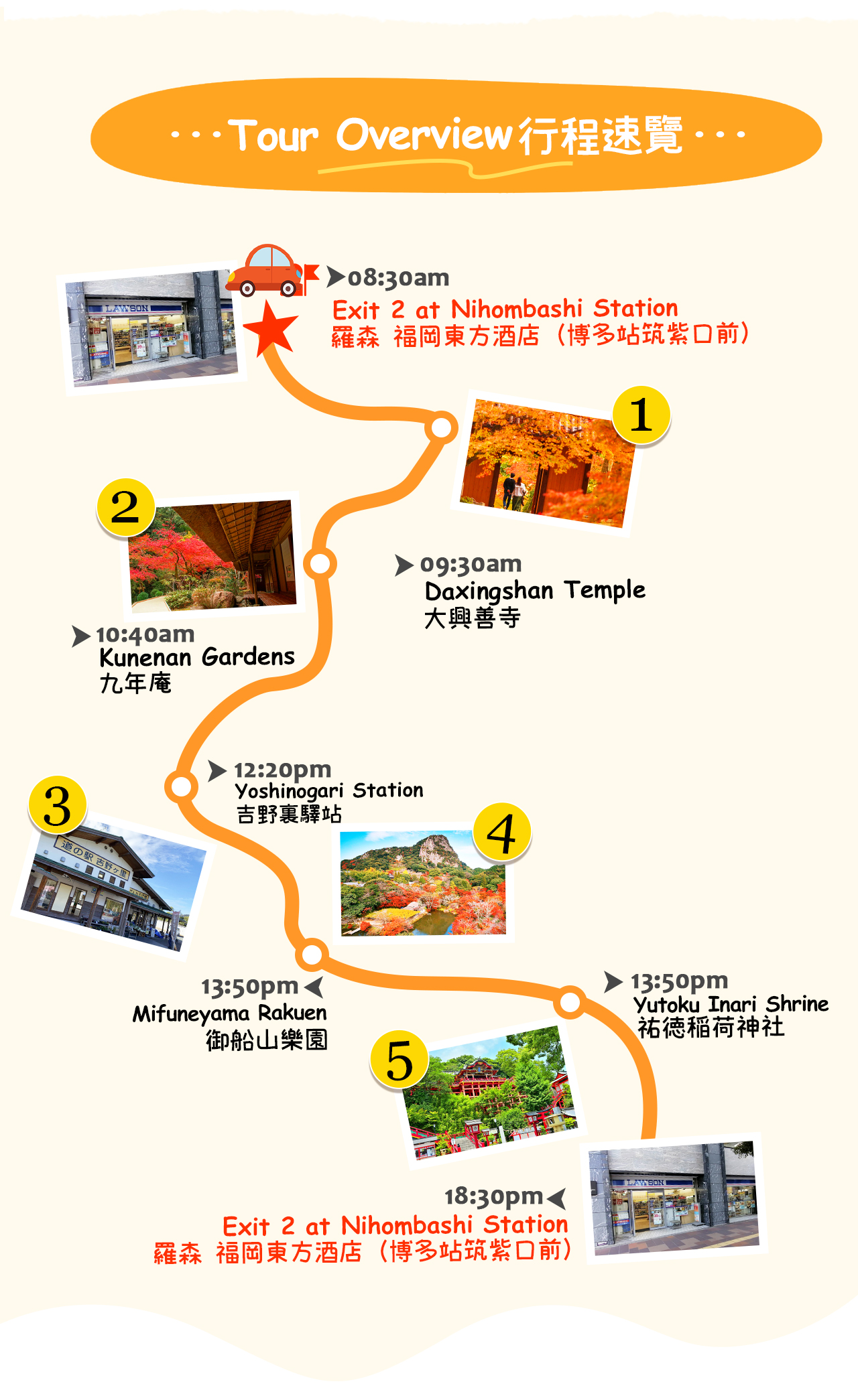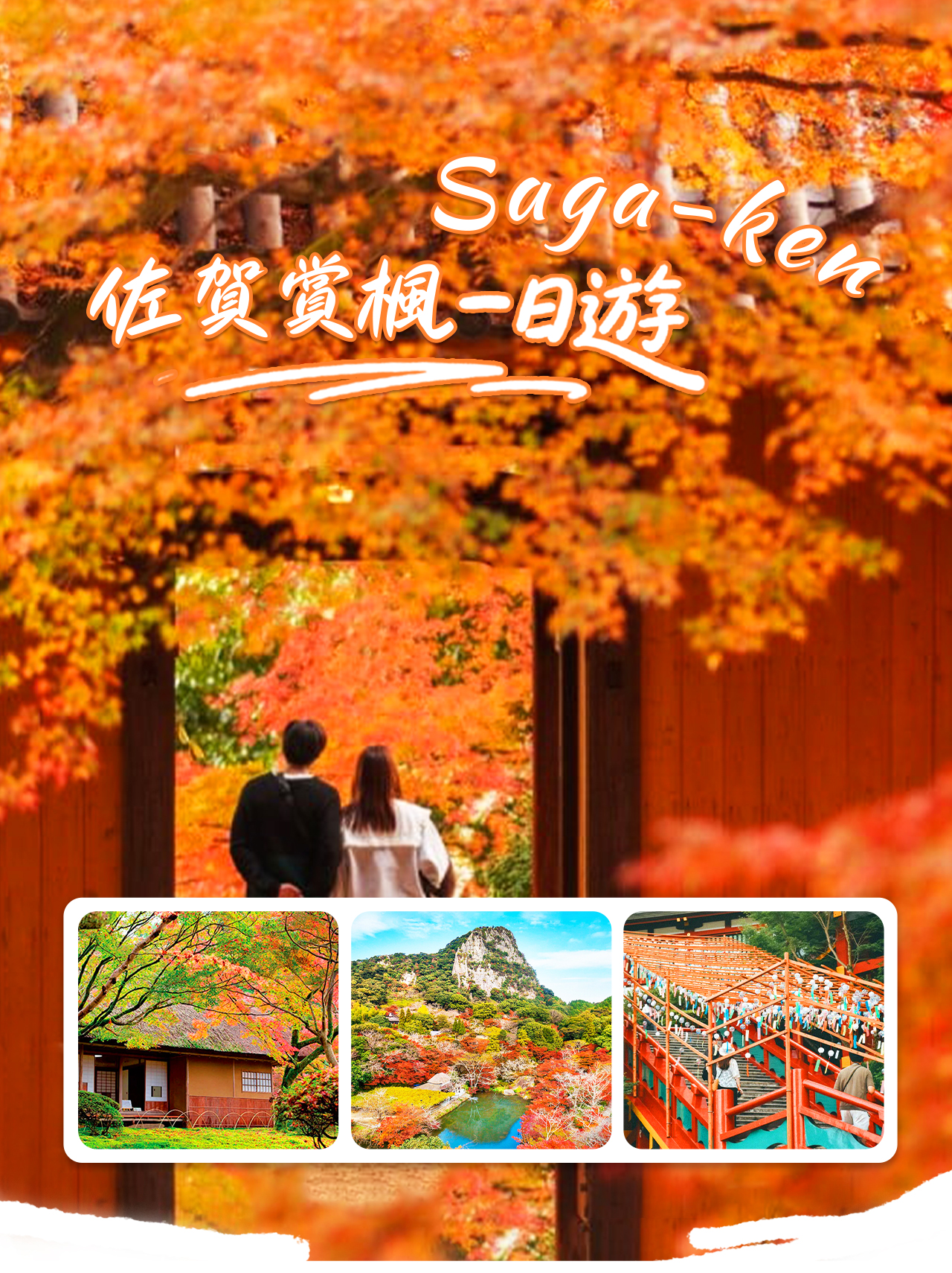 **규슈 단풍 명소 비경 당일치기 여행: 사가현 산림 속 고찰 정원과 신사 단풍 탐험** 후쿠오카에서 출발하는 당일치기 여행으로 사가현 최고의 단풍 명소를 방문합니다. 첫 번째 목적지는 유서 깊은 다이코젠지입니다. 1300년이 넘는 역사를 지닌 천태종 고찰은 산기슭에 자리 잡고 있습니다. 가을이 되면 사찰 내 3,000그루 이상의 단풍나무가 계곡을 붉게 물들이고 석단을 덮고 전각을 비추어 고찰의 고요하고 장엄함과 찬란한 단풍이 어우러져 마치 시간 속으로 들어온 듯한 느낌을 줍니다. 다음으로 향하는 곳은 규넨암입니다. 메이지 시대 개인 별장과 회유식 일본 정원은 주인이 9년에 걸쳐 심혈을 기울여 조성한 데서 이름이 유래되었습니다. 정원에는 산수 배치와 이끼 정원이 조화를 이루고 있으며, 가을 단풍이 가장 아름답습니다. 11월 중순부터 말까지만 개방되며, 만개한 단풍과 고택, 이끼 정원이 어우러져 고요하고 우아한 가을 풍경을 연출합니다. 점심은 요시노가리 휴게소에서 휴식을 취하며 사가현 특산 향토 요리와 수제 도시락을 즐길 수 있을 뿐만 아니라 고대 벼농사 문화를 체험하고 현지 특산물 시장을 둘러볼 수 있는 체력 보충과 문화 체험을 위한 완벽한 중간 기착지입니다. 오후에는 미후네야마 라쿠엔에 도착합니다. 이곳은 사가현에서 가장 인기 있는 단풍 명소 중 하나로, 미후네 산을 따라 지어진 정원은 넓은 부지를 자랑하며 산, 물, 단풍, 돌이 조화를 이룹니다. 가을에는 수천 그루의 단풍나무와 은행나무가 온 산림을 붉게 물들이고, 호수에는 울긋불긋한 가을빛이 비쳐 그 사이를 거닐면 마치 동양화 속에 있는 듯한 느낌을 줍니다. 밤에는 단풍나무 조명 행사가 빛과 그림자를 단풍과 완벽하게 융합시켜 몽환적이고 매혹적인 분위기를 자아냅니다. 마지막 목적지는 일본 3대 이나리 신사 중 하나인 유토쿠 이나리 신사입니다. 신사는 1687년에 창건되었으며 사업 번창, 가정 부유, 교통 안전을 기원하는 곳으로 유명합니다. 가을에는 단풍이 비치는 주홍색 도리이가 숲 속에 길게 늘어서 있고, 좁은 길을 지나면 신비롭고 장엄한