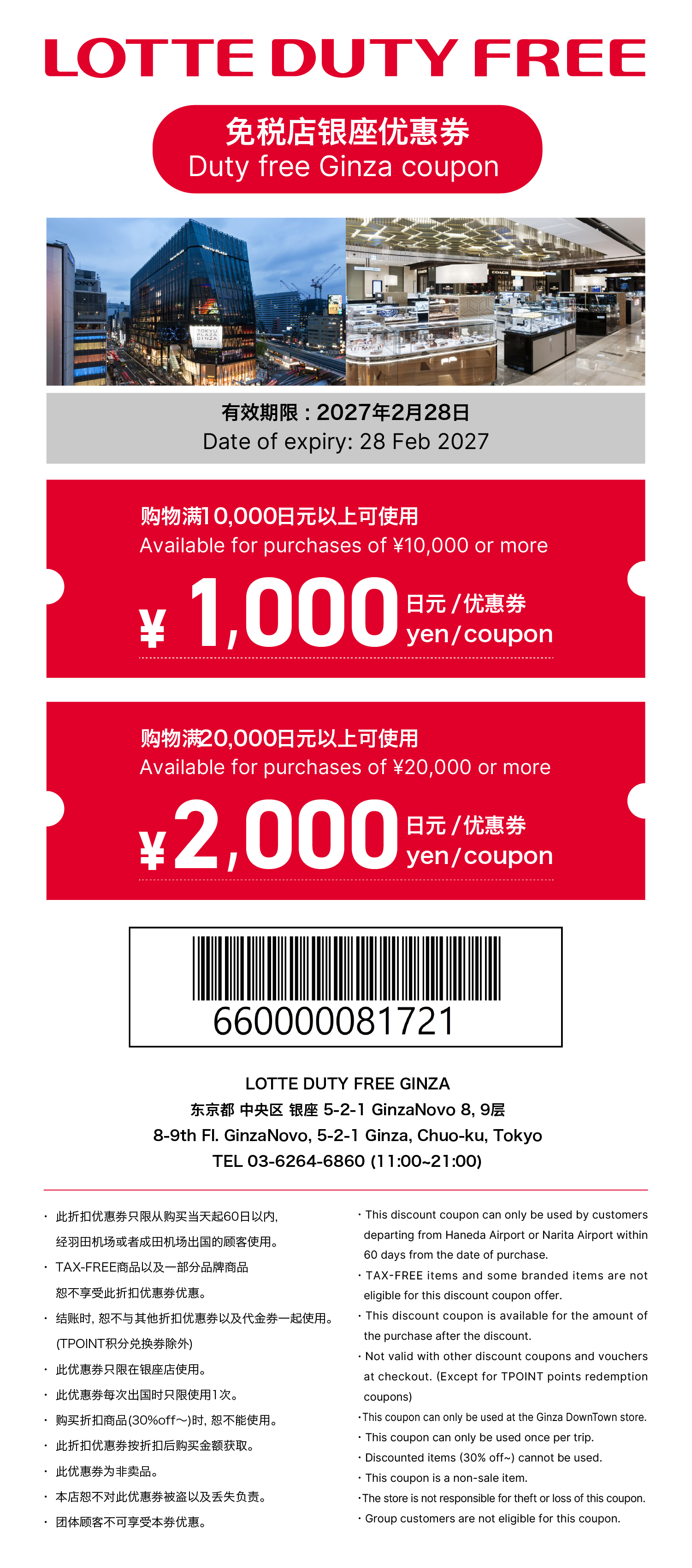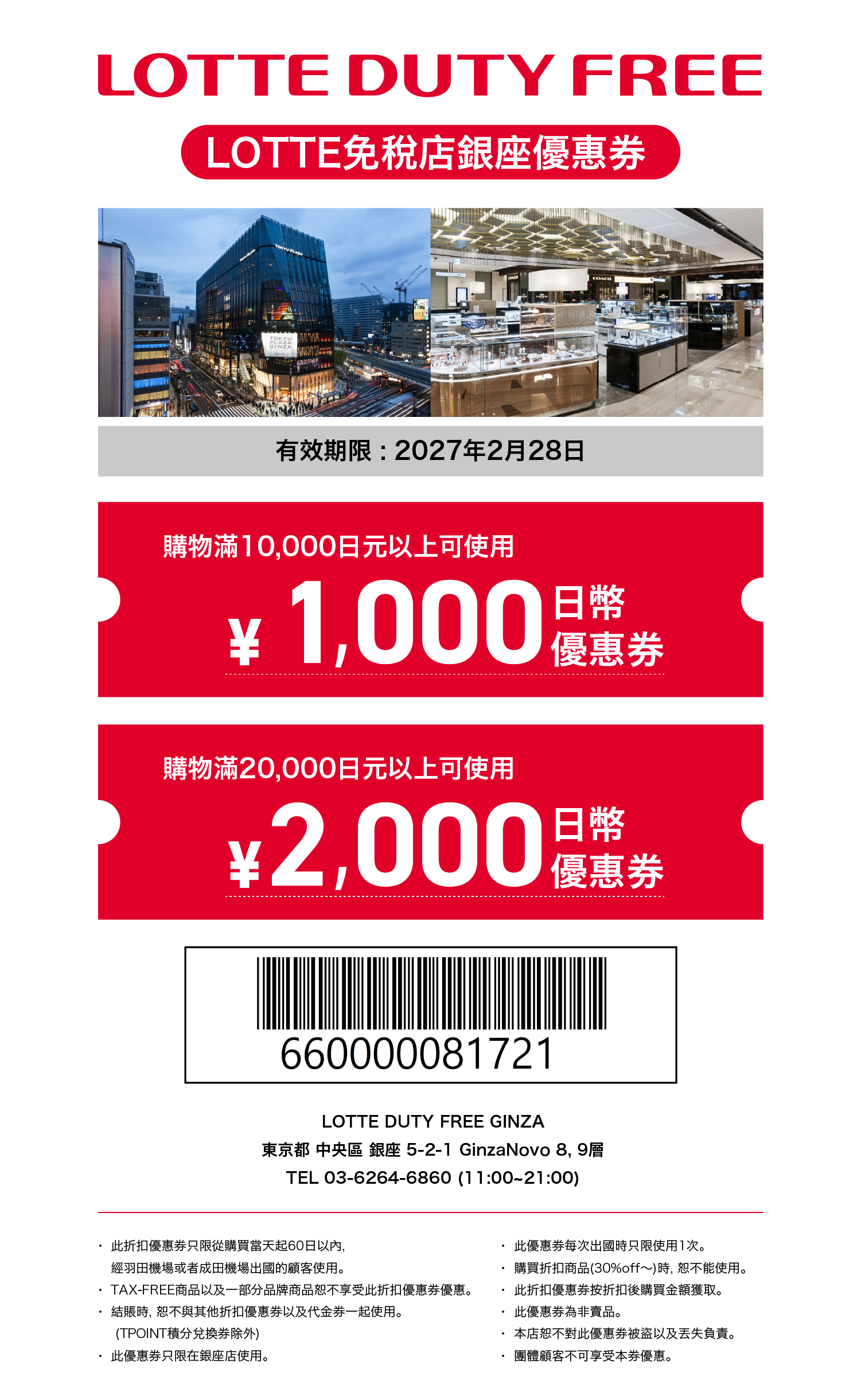 긴자노보 8~9층에 위치한 롯데면세점 도쿄 긴자점은 도쿄 최대 규모의 면세점입니다. 200개 이상의 다양한 브랜드와 현지 특산품을 면세 가격으로 만나볼 수 있는 도쿄 긴자점에서 원스톱 면세 쇼핑을 즐겨보세요. 면세 가격은 세금 면제로 인해 일반 소매 가격보다 훨씬 저렴합니다. 이 할인 쿠폰은 구매일로부터 60일 이내에 하네다 공항 또는 나리타 공항에서 출발하는 고객만 사용할 수 있습니다. 여행 중 롯데면세점 도쿄 긴자점에서 쿠폰 할인 혜택을 누리며 완벽한 쇼핑 경험을 만끽하세요.