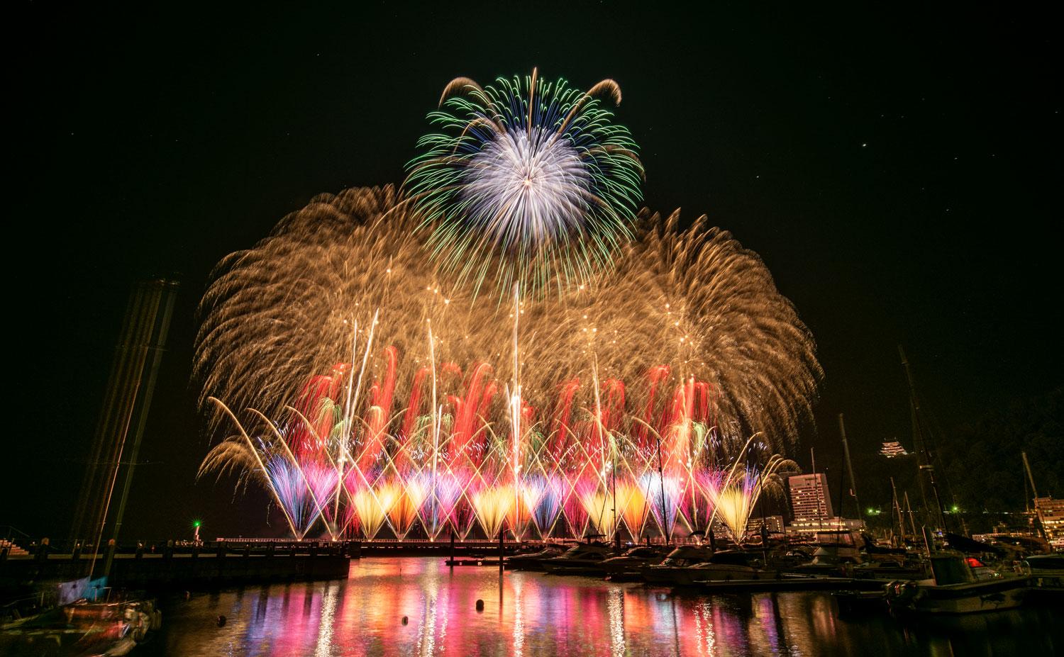 - 아타미 불꽃놀이 축제 - 바다 위로 쏟아지는 불꽃 폭포는 마치 꿈결 같고 낭만적입니다.
