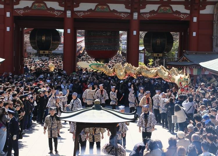 축제의 하이라이트는 경내에서 펼쳐지는 금룡의 춤(긴류노마이)입니다. 이 역동적이면서도 우아한 춤은 스미다 강에서 불상이 건져 올려졌을 때 하늘에서 황금 용이 내려와 하룻밤 사이에 수천 그루의 소나무를 만들어냈다는 전설에서 영감을 받았습니다. 전체 길이 18m, 무게 88kg의 거대한 황금 용이 하늘을 수놓으며 전설을 생생하게 재현합니다.