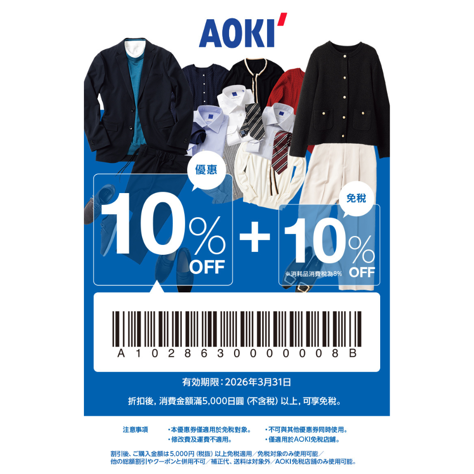 他の総額割引やクーポンと併用不可/補正代、送料は対象外/AOKI免税店舗のみ使用可能。