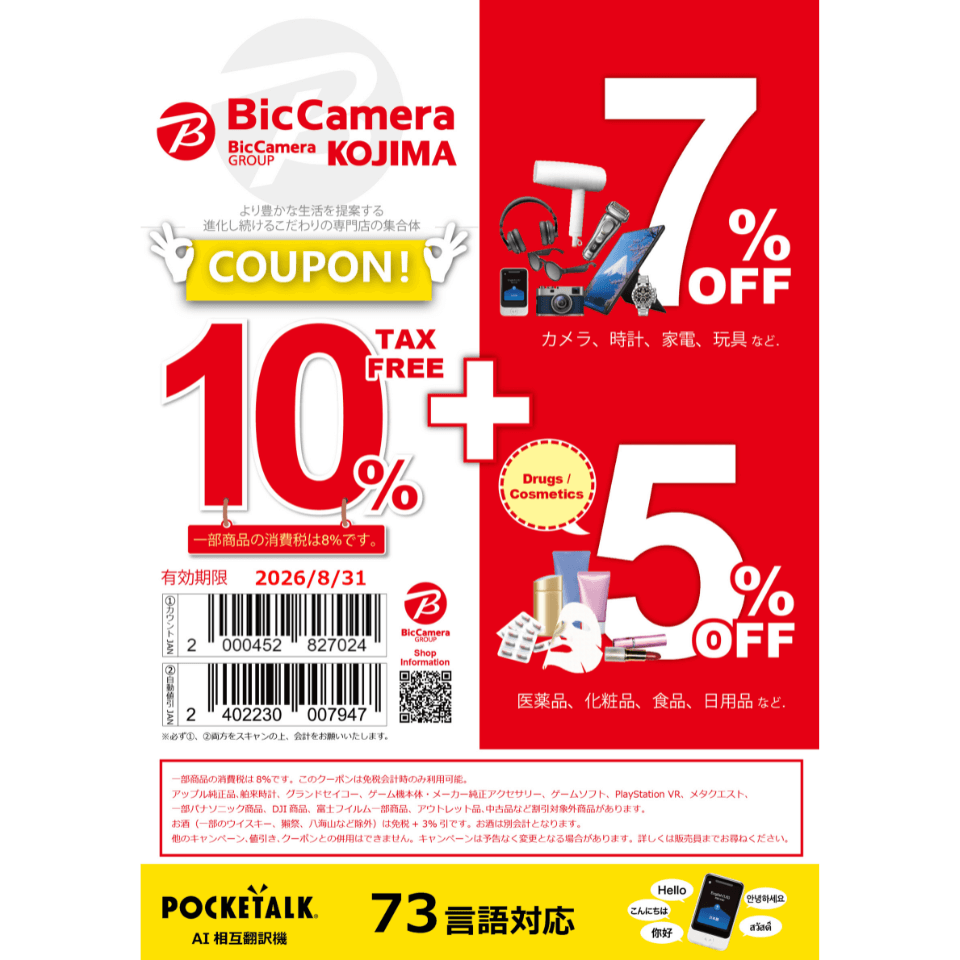一部商品の消費税は8%です。 このクーポンは免税会計時のみ利用可能。 アップル純正品、ロレックス、 ゲーム機本体、 PlayStation VR、 ソフト・ 純正アクセサリー、一部パナソニック商品、 ウイスキー等の一部お酒、 アウトレット品、中古品など割引対象外商品があります。 日本酒 (獺祭・ 八海山除く)は免税 +3%引です。 お酒は酒販レジのみお会計可能です。 他のキャンペーン、値引き、 クーポンとの併用はできません。 キャンペーンは 予告なく変更となる場合があります。 詳しくは販売員までお尋ねください。
