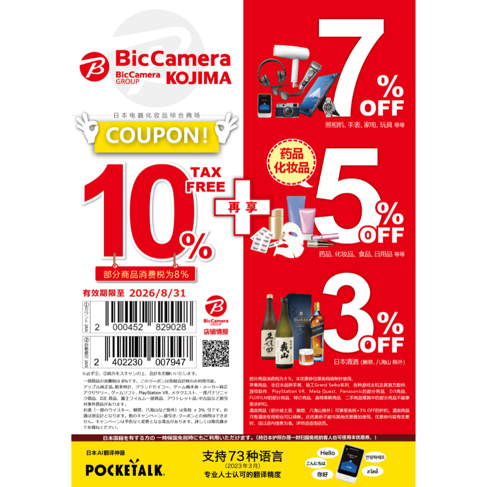 部分商品消费税为8%。本优惠券仅限免税结账时使用。苹果产品、 劳力士、各种游戏主机及其官方配件和游戏软件、PlayStation VR、 Panasonic 的部分商品、威士忌等部分酒类、特价商品、奥特莱斯商品、 二手商品等其中的部分商品不能享受该折扣。日本清酒(獭祭、八海山 除外)可享受免税+3%OFF的折扣。酒类商品只有酒类专用柜台可以 结帐。此优惠券不能与其他优惠叠加使用。优惠券内容有变更时,请以 店内信息为准。详情请咨询店员。