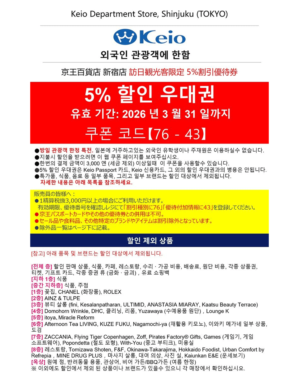 [이용 약관] ●한번의 결제 금액이 3,000 엔 (세금 제외)이상 일때 이 쿠폰을 사용할 수 있습니다. ●가능한 지불 방법: 현금 (JPY), 신용 카드, UnionPay, Alipay+, WeChatPay ●5% 할인 우대권은 Keio Passport 카드, Keio 신용카드, 그 외 할인 우대권과의 병용은 안됩니다. [참고] 아래 품목 및 브랜드는 할인 대상에서 제외됩니다. [전체 층] 할인 판매 상품, 식품, 카페, 레스토랑, 수리 · 가공 비용, 배송료, 원단 비용, 각종 상품권, 티켓, 기프트 카드, 각종 증권 류 (금화 · 금괴),유료 쇼핑백 [지하 1층] 식품 [중간 지하층] 식품, 주점 [1층] 꽃집, CHANEL (화장품), ROLEX [2층] AINZ & TULPE [3층] 뷰티 살롱 (fini, Kesalanpatharan, ULTIMID, ANASTASIA MIARAY, Kaatsu Beauty Terrace) [4층] Domohorn Wrinkle, DHC, 클리닝, 리폼, Yuzawaya (수예용품 원단),Lounge K [5층] itoya、Miracle Reform [6층] Afternoon Tea LIVING, KUZE FUKU, Nagamochi-ya (재활용 키모노), 이와키 메가네 일부 상품, 도검 [7층] ZACCANIA, Flying Tiger Copenhagen, Zoff, Pirates Factory® Gifts, Games (게임기, 게임 소프트웨어), Popondetta (철도 모형), With-You (중고 부티크), 미용실 [8층] 레스토랑, Tomizawa Shoten, F&F, Okinawa-Takarajima, Hokkaido Foodist, Urban Comfort by Refrepia,MINE DRUG PLUS,마사지 살롱, 대여 의상, 사진 실, Kaiunkan E&E (운세보기) [옥상] 원예 점, 반려동물 용품, 관상어, 비어 가든/BBQ가든 (여름 한정) ※ 이외에도 할인에서 제외 된 상품이나 브랜드가 있을수 있으니 각 매장에서 확인하십시오.