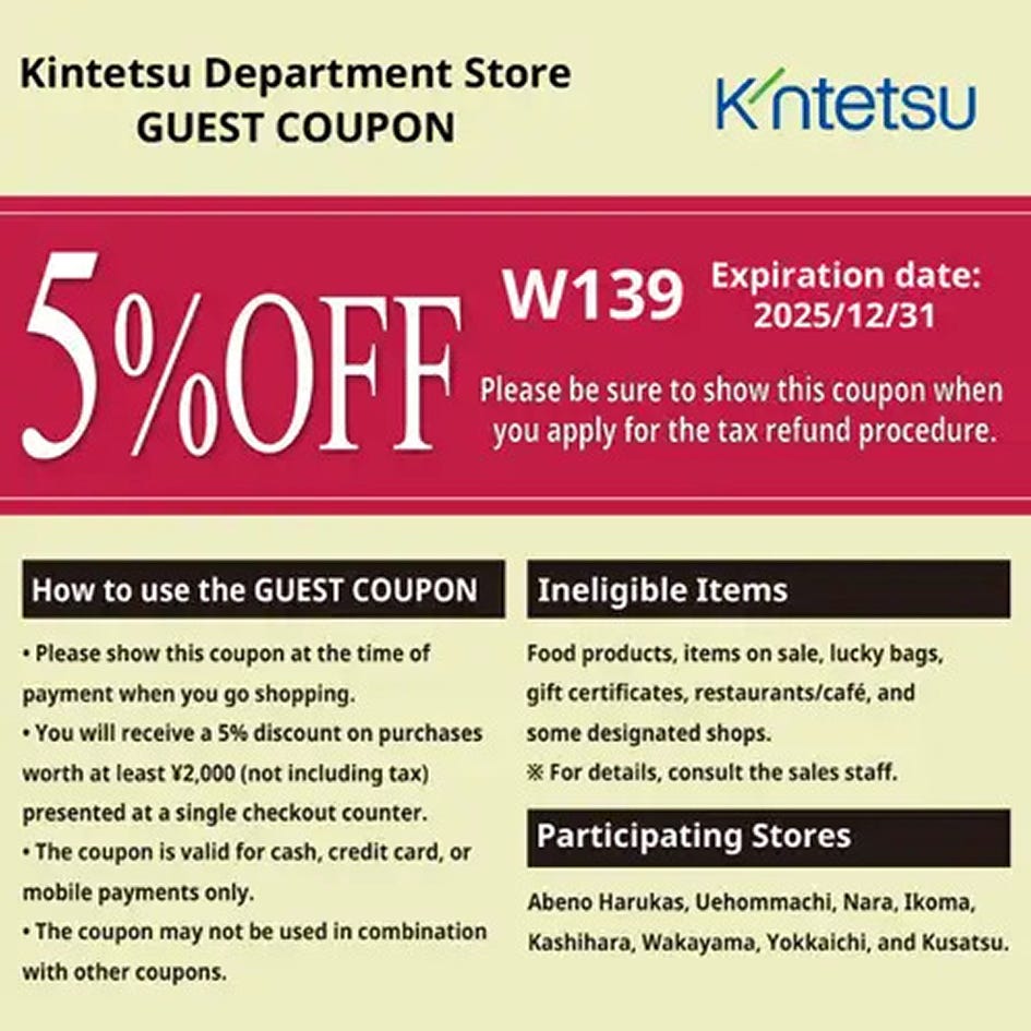 「Kintetsu Dept. Store」GUEST COUPON. Please present this coupon image at the time of checkout and during tax-exemption procedures. If you have any questions, please feel free to ask our staff.
