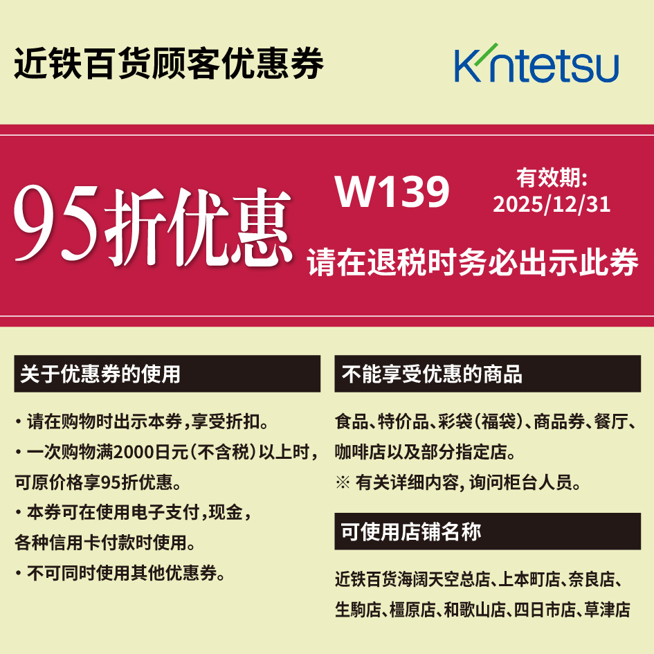 「近铁百货」GUEST COUPON。请在结账时及办理免税手续时出示此优惠券图片。如有任何疑问,请向工作人员咨询。