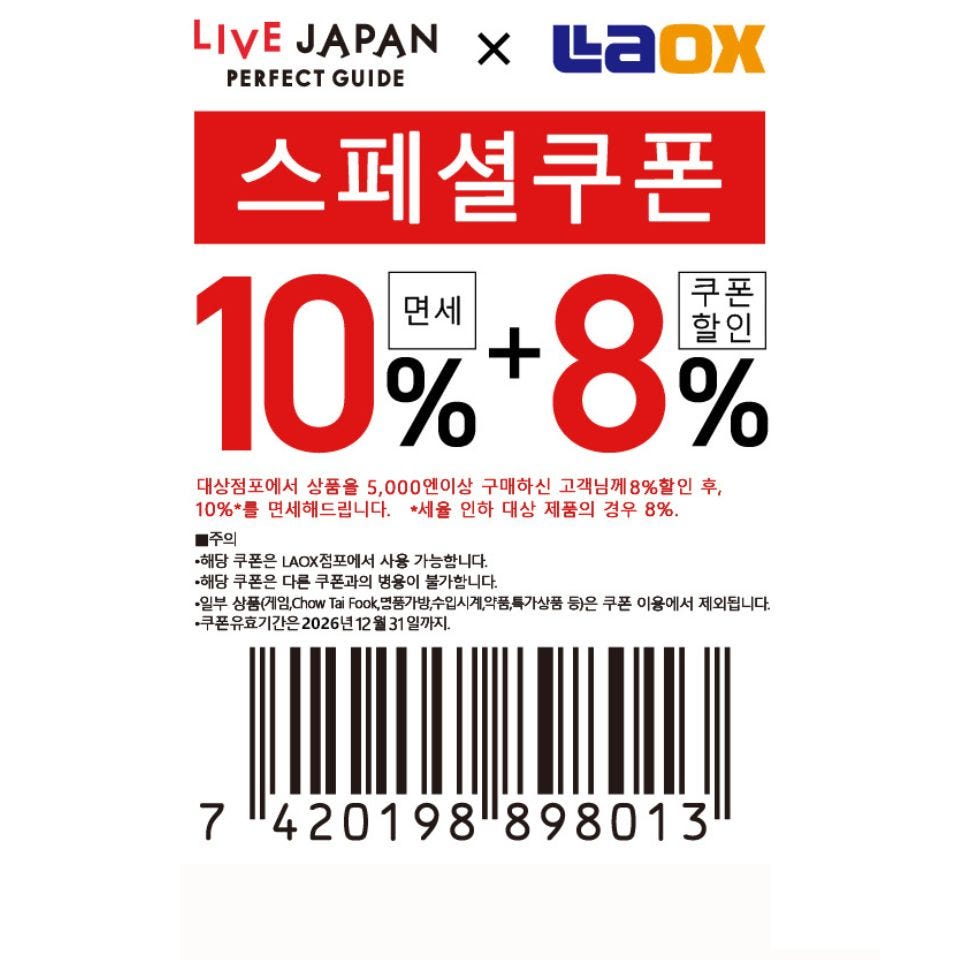 대상점포에서 상품을 5,000엔이상 구매하신 고객님께 8%할인 후, 10%*를 면세해드립니다. *세율 인하 대상 제품의 경우 8%. ■주의 ・해당 쿠폰은 LAOX 점포에서 사용 가능합니다. ・해당 쿠폰은 다른 쿠폰과의 병용이 불가합니다. ・일부 상품(게임,Chow Tai Fook,명품가방,수입시계,약품,특가상품 등)은 쿠폰 이용에서 제외됩니다.