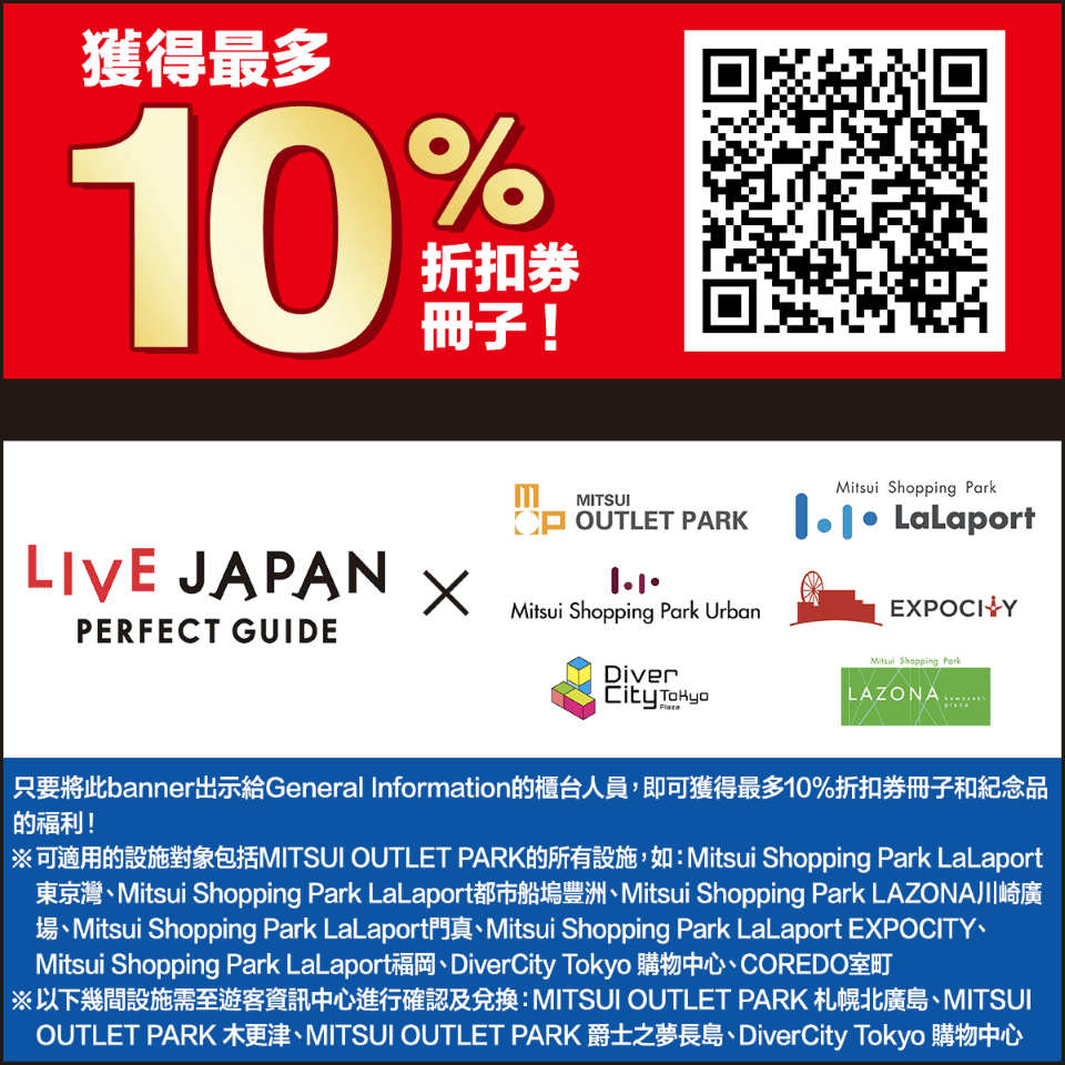 只要將此畫面出示給旅客諮詢的櫃台人員,即可獲得最多10%折扣券冊子和紀念品的福利! 若設施沒有旅客諮詢櫃台,請向一般櫃台人員出示此畫面。 ※可適用的設施對象包括MITSUI OUTLET PARK的所有設施,如:Mitsui Shopping Park LaLaport東京灣、Mitsui Shopping Park LaLaport都市船塢豐洲、Mitsui Shopping Park LAZONA川崎廣場、Mitsui Shopping Park LaLaport門真、Mitsui Shopping Park LaLaport EXPOCITY、Mitsui Shopping Park LaLaport福岡、DiverCity Tokyo 購物中心、COREDO室町 ※以下幾間設施需至遊客資訊中心進行確認及兌換:MITSUI OUTLET PARK 札幌北廣島、MITSUI OUTLET PARK 木更津、MITSUI OUTLET PARK 爵士之夢長島、DiverCity Tokyo 購物中心