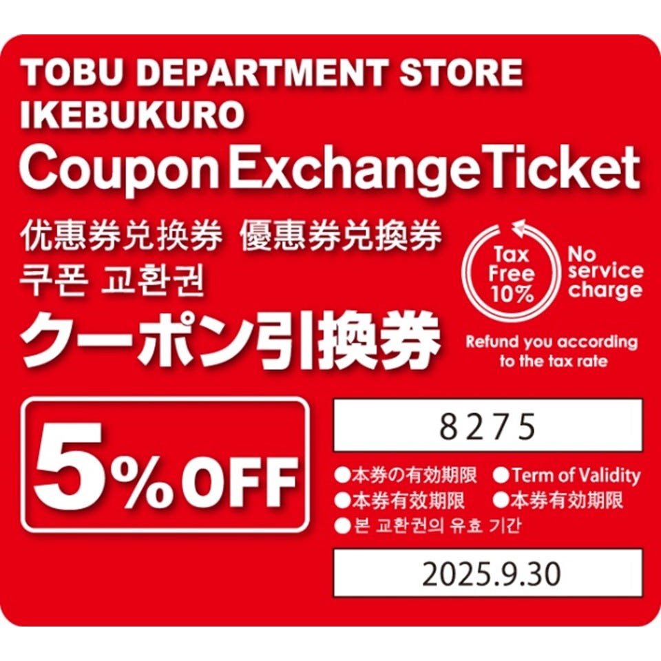 ●请本人持本券与护照至2F1号区 旅行咨询处,以本券兑换95折购物优惠券。※每人仅限使用一张。 ●95折购物优惠券可用于单价1,000日元(未含税)以上的商品。〈仅限现金(日元)、银联卡、支付宝、微信支付〉 ●本券不可与东武卡、其他优惠券、优惠卡同时使用。 ●不适用于折扣的商品、服务、商店: 食品(部分提供折扣)、特卖品、福袋、礼券类、烟草、书籍、TIFFANY、优衣库、DAISO、Nikohapikids、活动卖场、餐饮、咖啡厅、美食街SPICE、Hasegawa、Nojima、Takumi Otsuka、及其他本公司指定的商品和服务。详情请洽销售人员。