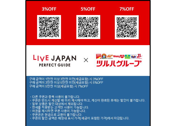 ・구매 금액이 1만엔 이상 3만엔 미만(세금포함) 시 3%OFF ・구매 금액이 3만엔 이상 5만엔 미만(세금포함) 시 5%OFF ・구매 금액이 5만엔 이상(세금포함) 시 7%OFF ・다른 쿠폰과 중복 사용이 불가합니다. ・쿠폰은 반드시 계산할 때 미리 제시해야 하고, 계산이 완료된 후에는 할인이 불가합니다. ・일부 상품은 할인 대상에서 제외됩니다. ・면세를 적용받는 고객만 사용이 가능합니다. ・여권을 제시하면 쿠폰 사용이 가능합니다. ・쿠폰권은 현금으로 교환이 불가합니다. ・쿠폰의 할인 금액은 매장내 표시 가격 ・(세금이 포함된 가격)에서 차감됩니다.