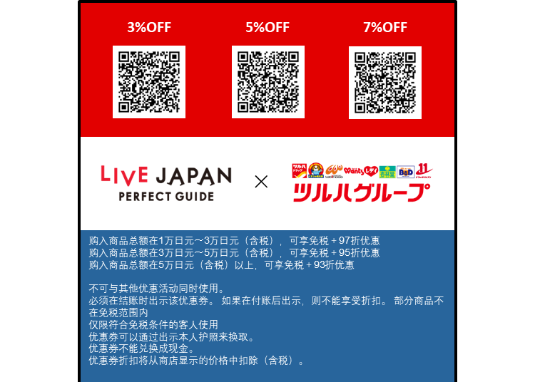 购入商品总额在1万日元〜3万日元(含税),可享免税+97折优惠 购入商品总额在3万日元〜5万日元(含税),可享免税+95折优惠 购入商品总额在5万日元(含税)以上,可享免税+93折优惠 不可与其他优惠活动同时使用。 请在结帐时出示优惠券,结账后将不予受理。 →必须在结账时出示该优惠券。 如果在付账后出示,则不能享受折扣。 部分商品不在免税范围内。 仅限符合免税条件的客人使用。 优惠券可以通过出示本人护照来换取。 优惠券不能兑换成现金。 优惠券折扣将从商店显示的价格中扣除(含税)。