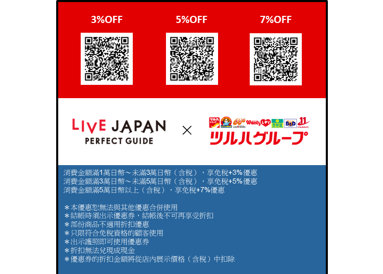 *消費金額滿1萬日幣〜未滿3萬日幣(含稅),享免稅+3%優惠 *消費金額滿3萬日幣〜未滿5萬日幣(含稅),享免稅+5%優惠 *消費金額滿5萬日幣以上(含稅),享免稅+7%優惠 *本優惠恕無法與其他優惠合併使用 *結帳時須出示優惠券,結帳後不可再享受折扣 *部份商品不適用折扣優惠 *只限符合免稅資格的顧客使用 *出示護照即可使用優惠券 *折扣無法兌現成現金 *優惠券的折扣金額將從店內展示價格(含稅)中扣除