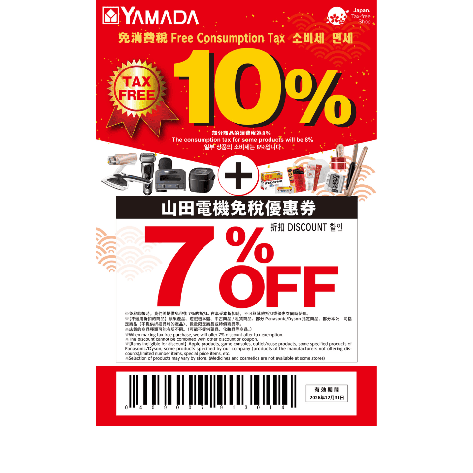- 各種クーポンは1回につき1枚のご利用となります。 - クーポン券ご利用時は、必ず精算前にクーポンをご提示ください。 - 本クーポン券は当社指定の免税店舗のみのご利用となります。 - 本クーポン券を分けてご利用することはできません。また現金に換金することもできません。 - 本クーポンはギフト券・商品券の購入時にはご利用することはできません。 - クーポン割引対象外商品:Apple_製品、ゲーム機本体、アウトレット・リユース商品、Panasonic/Dysonの一部指定商品、台数限定商品や特価品など。 - 本クーポン券は他の販促との併用はできません。 - 一部店舗では品揃えが異なる場合がございます。(医薬品・化粧品の取り扱いがない場合がございます) よくある質問 (FAQ) Q1. 対象店舗を教えてください。A. 全国約300店舗以上の免税対応店舗で利用可能です。主要なブランドである LABI (ラビ)、Tecc Land (テックランド)、Tecc LIFE SELECT に加え、Best Denki (ベスト電器) でもご利用いただけます。Q2. 当日はスマートフォンの提示だけよいですか。A. はい、スマートフォンで画面を提示するだけで利用可能です。レジでバーコードをスキャンするため、画面の明るさを最大にしてご提示ください。Q3. 免税に必要なものを教えてください。A. 入国スタンプのある有効なパスポート原本が必要です。コピーや写真では免税手続きができませんのでご注意ください。Q4. Apple製品/ゲーム機は対象ですか。A. 一部のブランド製品やゲーム機本体は、クーポンの割引対象外となる場合や、割引率が異なる場合があります。購入前に必ず店舗スタッフへご確認ください。Q5. 利用回数の制限はありますか。A. いいえ、有効期限内であれば、対象店舗でのお買い物のたびに何度でもご利用いただけます。Q6. 空港店舗での利用は可能ですか。A. はい、成田空港などの店舗でも利用可能ですが、空港店舗は取り扱い商品が限定されている場合があります。Q7. 決済手段(カード利用)は可能ですか。A. はい、現金だけでなく、クレジットカードやUnionPay(銀聯カード)、Alipay、WeChat Payなど、店舗が対応している決済手段であれば割引が適用されます。Q8. 消耗品の対象可否を教えてください。A. 免税対象金額(税込5,500円以上)を満たせば対象です。ただし、日本国内で消費しないよう指定の袋に梱包される場合があります。また、一部店舗では医薬品等の取り扱いがない場合があります。Q9. セール品との併用は可能ですか。A. 店頭表示価格からの割引となりますが、台数限定の特売品や処分品など、一部併用できない場合があります。Q10. 商品券・ギフトカードの購入は可能ですか。A. いいえ、商品券やギフト券(vouchers)の購入にこのクーポンは使用できません。また、クーポンを現金と引き換えることもできません。