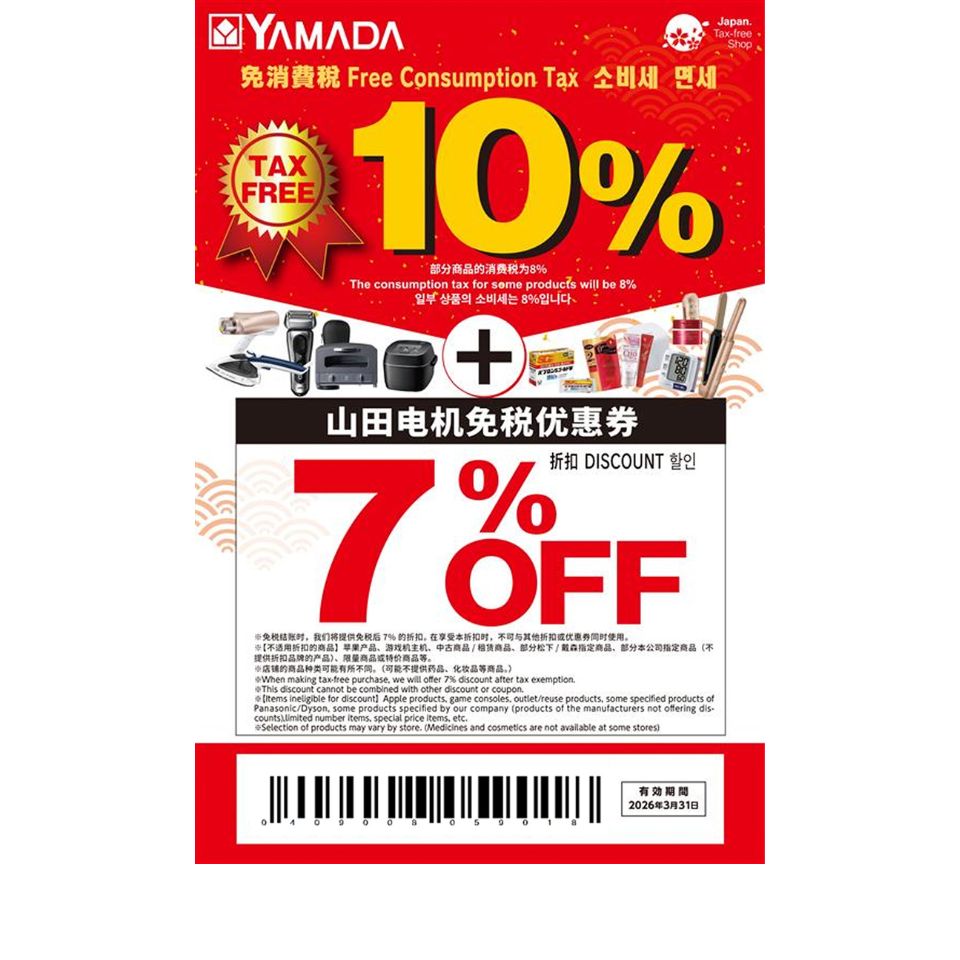 每次限用一张优惠券。 使用优惠券时,请务必在结账前出示。 本优惠仅限于本公司指定的免税店铺使用。 本优惠券不可分开使用,亦不可兑换现金。 本优惠券不得用于购买礼券或商品券。 优惠券折扣不适用商品:Apple产品、游戏机本体、Outlet/二手商品、Panasonic/Dyson部分指定商品、限量商品及特价品等。 此优惠折扣活动不能与其他优惠活动并用。 各店的商品种类可能有所不同。(部分店铺可能不销售药品或化妆品) 常见问题 (FAQ) Q1. 请问哪些店铺可以使用? A. 全国300多家免税店均可使用。除了主要品牌 LABI、Tecc Land、Tecc LIFE SELECT 之外,Best Denki (山田电机) 也可以使用。 Q2. 当天只需出示手机画面吗? A. 是的,只需在手机上出示优惠券画面即可。结账时需扫描条形码,请将手机屏幕亮度调至最高后出示。 Q3. 办理免税需要带什么? A. 您需要携带盖有入境章的护照原件。请注意,复印件或照片无法办理免税手续。 Q4. Apple产品或游戏机可以使用优惠券吗? A. 部分品牌产品或游戏机主机可能不参加折扣,或者折扣率有所不同。请在购买前务必向店内工作人员确认。 Q5. 有使用次数限制吗? A. 没有。只要在有效期内,您在对象店铺购物时可多次重复使用。 Q6. 可以在机场店使用吗? A. 可以。在成田机场等店铺也可以使用,但机场店的商品种类可能有限。 Q7. 可以使用哪些支付方式? A. 除了现金,只要是店铺支持的支付方式(如信用卡、银联卡、支付宝、微信支付等)均可享受折扣。 Q8. 消耗品是否属于折扣对象? A. 只要达到免税金额(含税5,500日元以上)即可享受折扣。但消耗品将被装入指定的免税密封袋,在日本境内不得拆封消费。 Q9. 可以和促销商品同时使用吗? A. 折扣基于店内标价。但部分限量特价品或清仓品可能无法同时使用优惠券。 Q10. 可以购买商品券或礼品卡吗? A. 不可以。此优惠券不能用于购买商品券或礼品卡,也不可兑换现金。