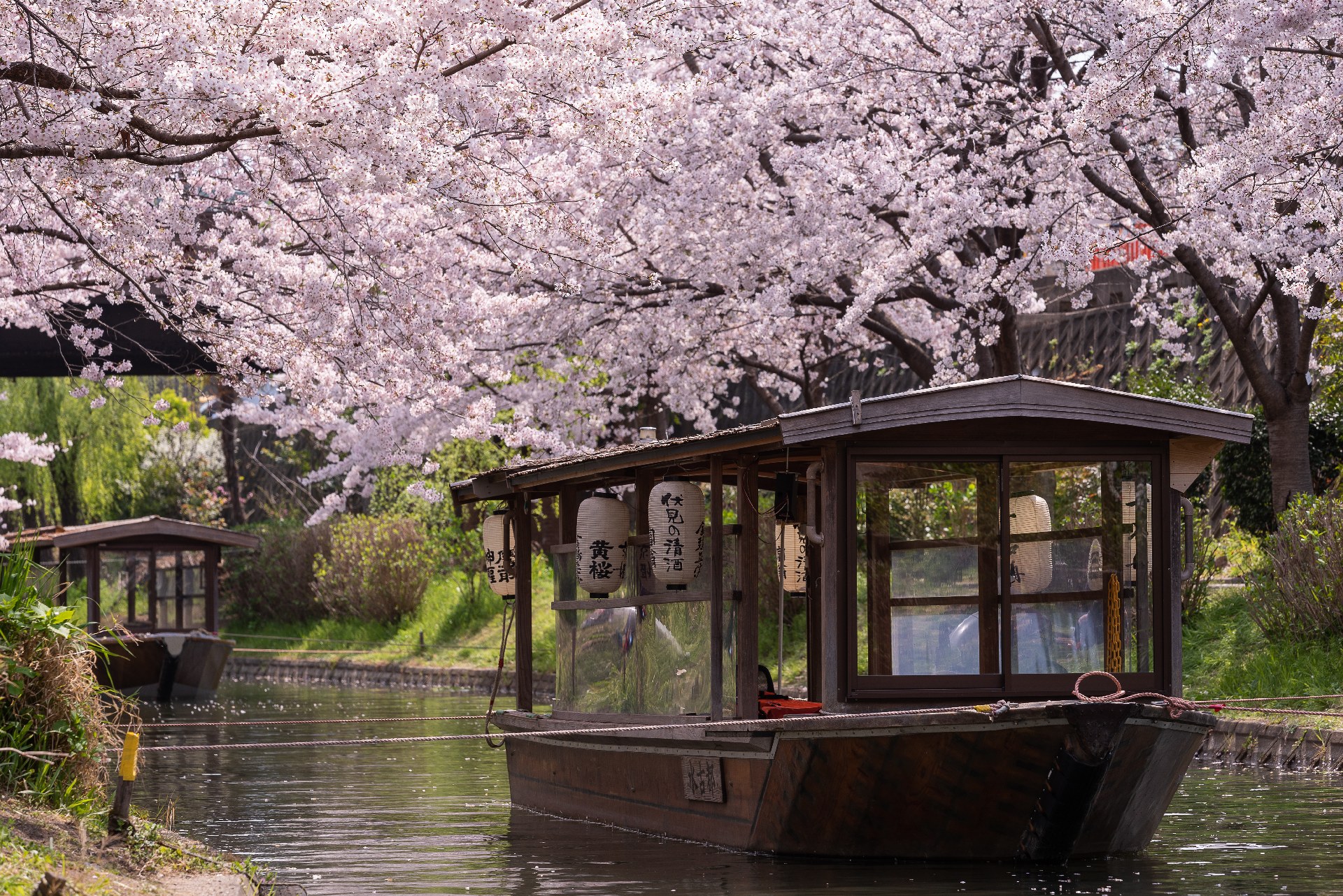 - ,?在京都伏见的古运河上,搭乘江户风情的十石舟,沿岸数百株染井吉野盛放,织就一条梦幻般的粉色隧道,美得令人屏息~