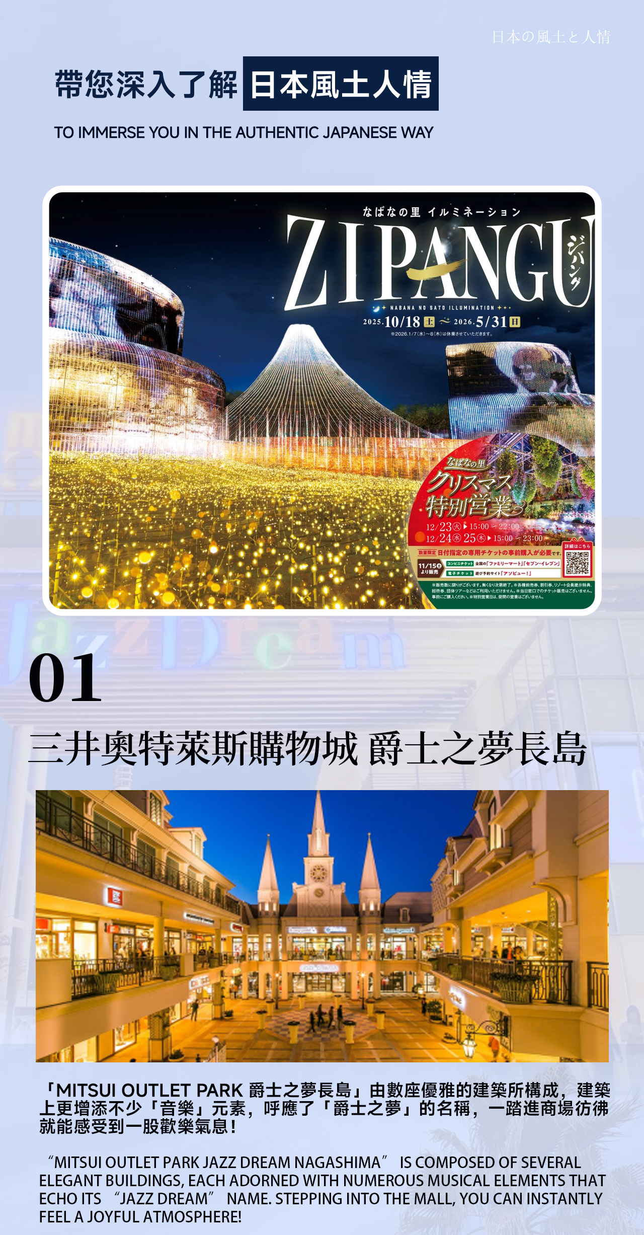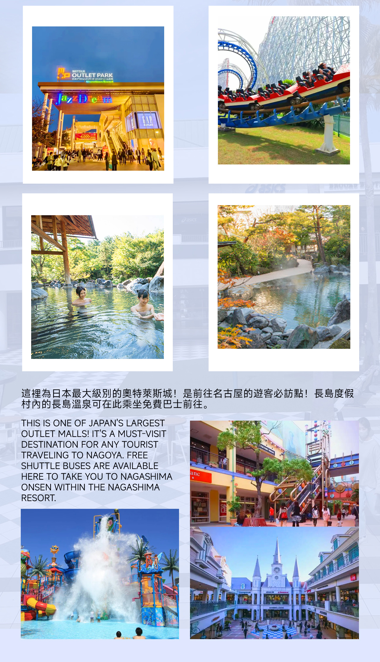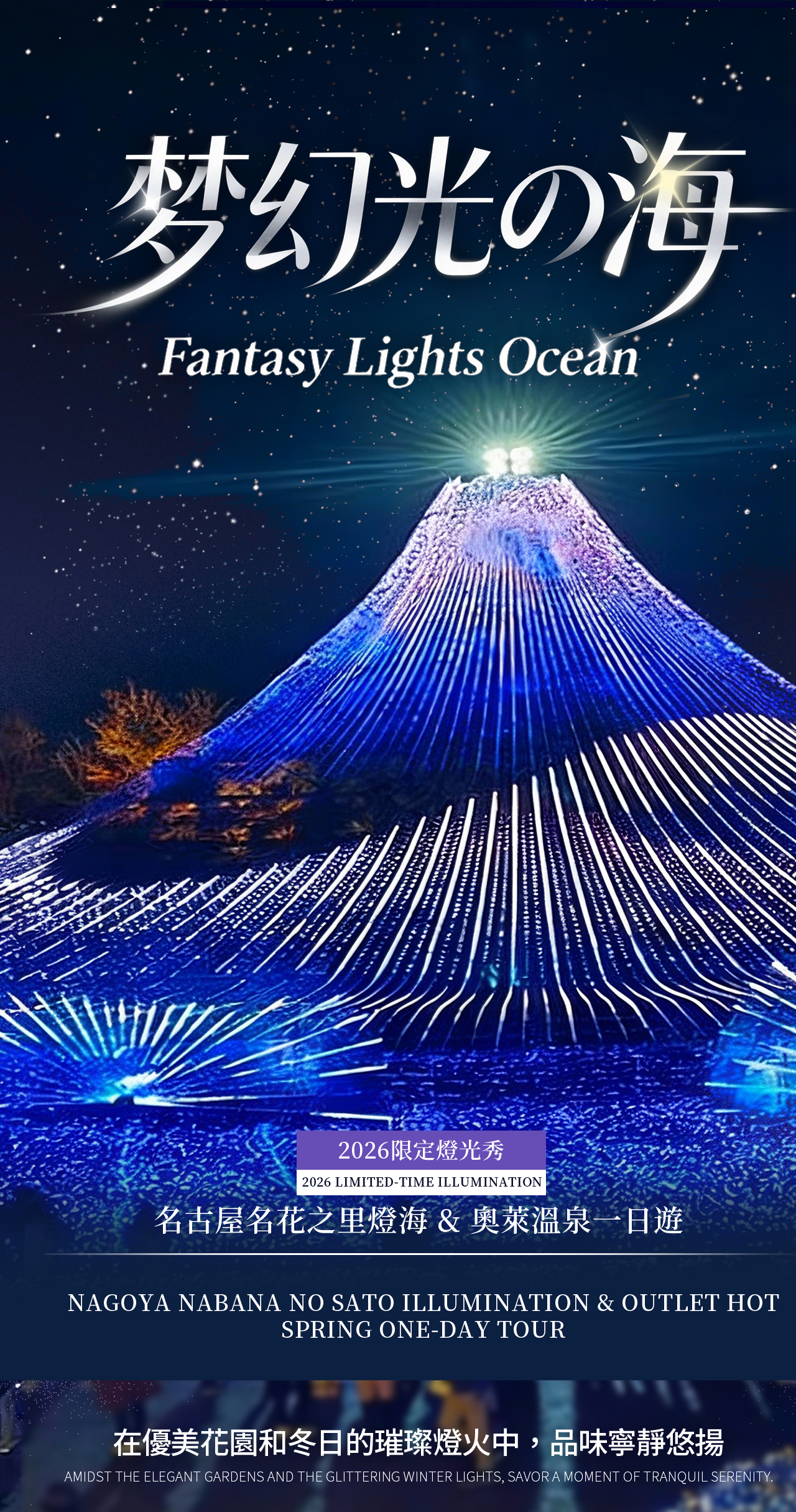 本行程从名古屋出发,带您一次畅游人气景点。白天前往日本最大规模的【**长岛奥特莱斯**】,自由购物、用餐,享受轻松惬意的逛街时光;傍晚走进【**名花之里**】欣赏日本最大灯光秀,漫步梦幻灯海与花园夜景之中。行程节奏舒适,交通省心,非常适合想轻松体验购物与夜景的旅客。