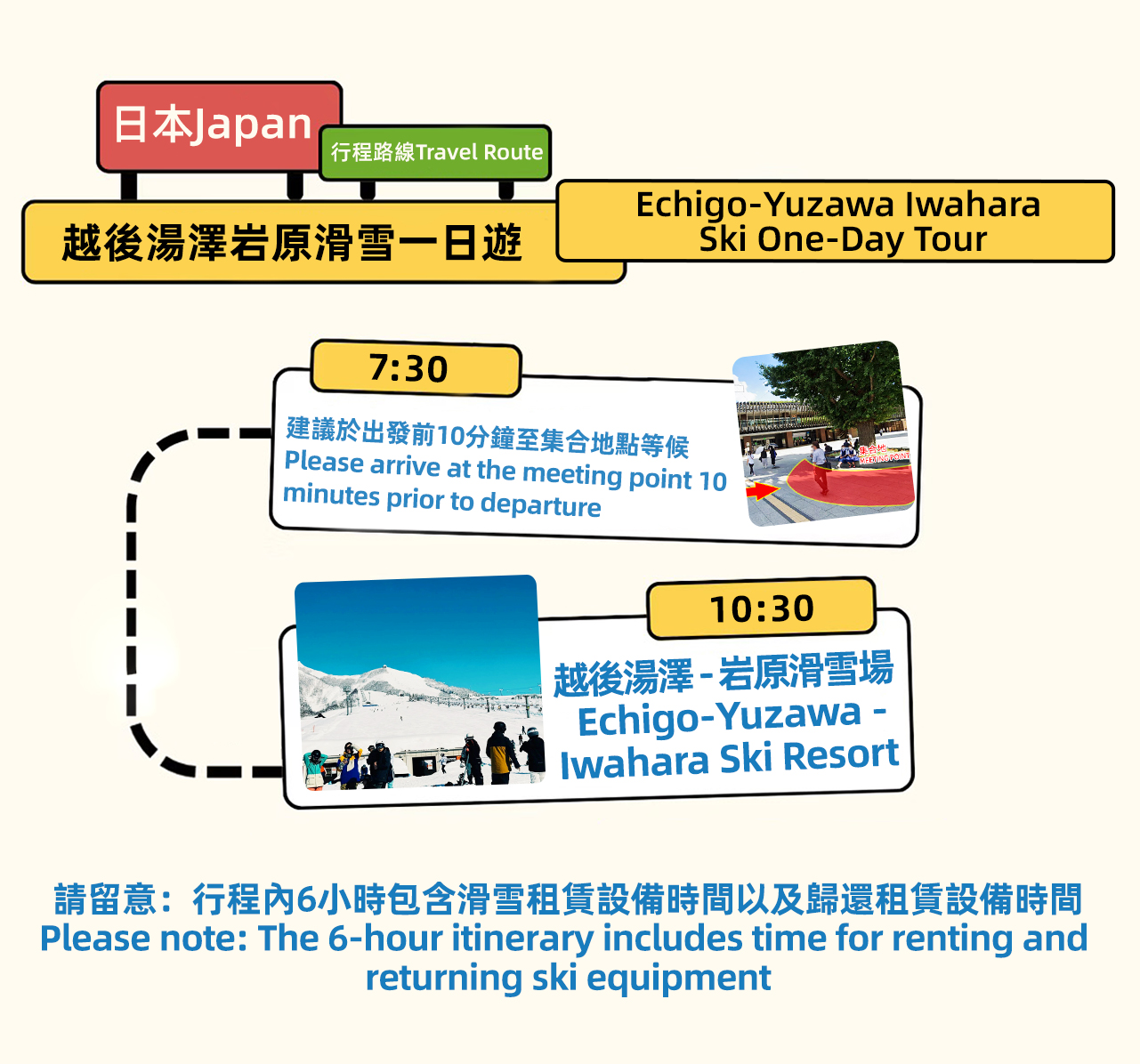 7:30 准时从JR上野站公园口广场出发,乘坐巴士前往新泻县岩原滑雪场 10:30 抵达雪场后,将协助您办理雪具租赁手续(根据所选方案内容) 10:30-15:30 为自由滑雪时间,您可在雪场内尽情体验: 初学者可选择缓坡练习区 中级者可挑战多样化雪道 高手可享受优质粉雪带来的极致滑行体验 雪场内设有餐厅,可自行用餐休息 16:00 准时集合乘车返回 19:00 左右抵达JR上野站公园口广场,结束愉快的滑雪之旅!