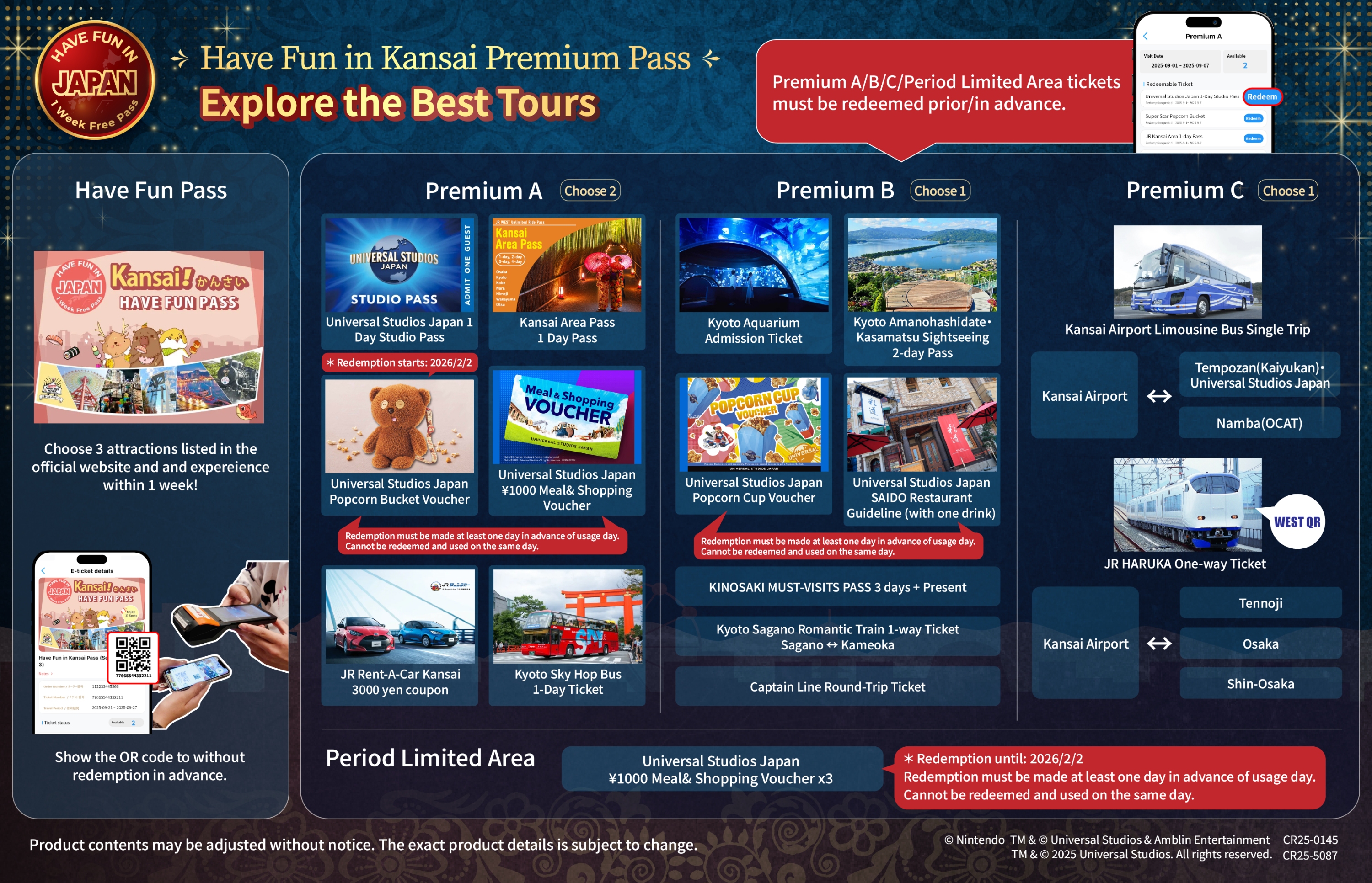 - * **关西乐享周游券:** 关西地区热门景点设施任选3,灵活安排时间游玩