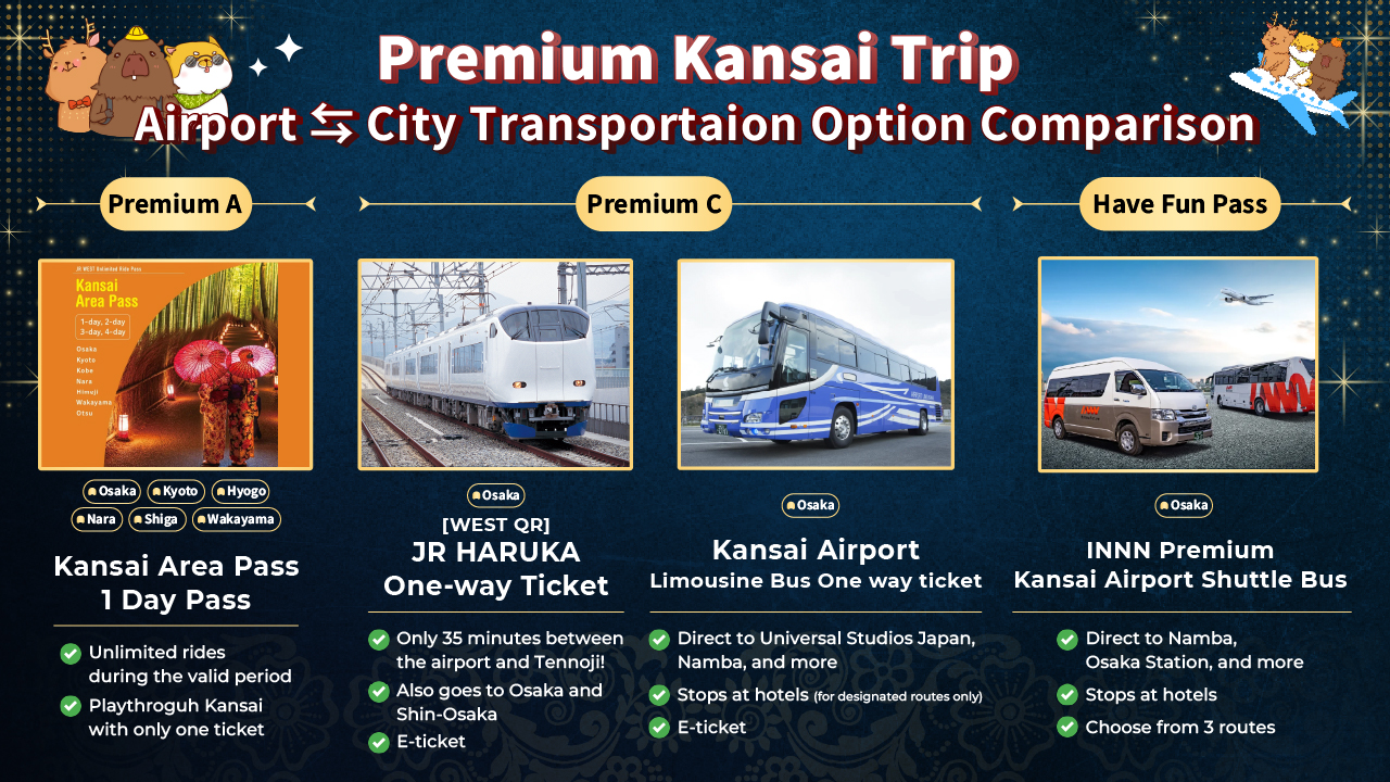 - * **便捷机场交通:** 关西机场利木津巴士单程票或关西机场特快“HARUKA”列车票