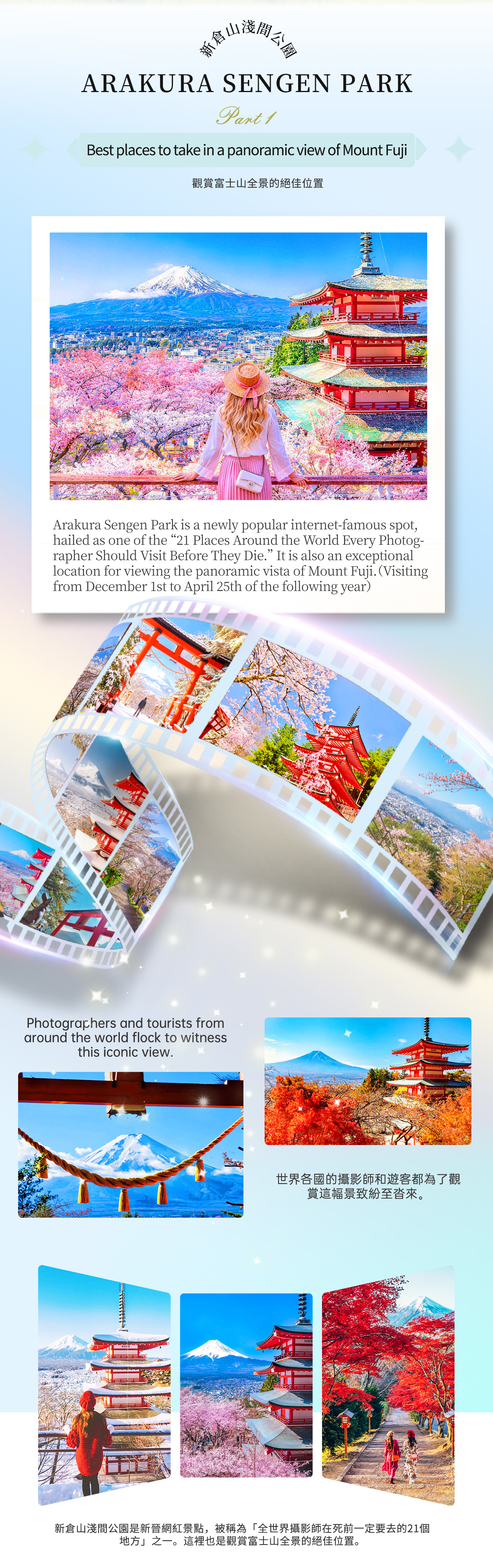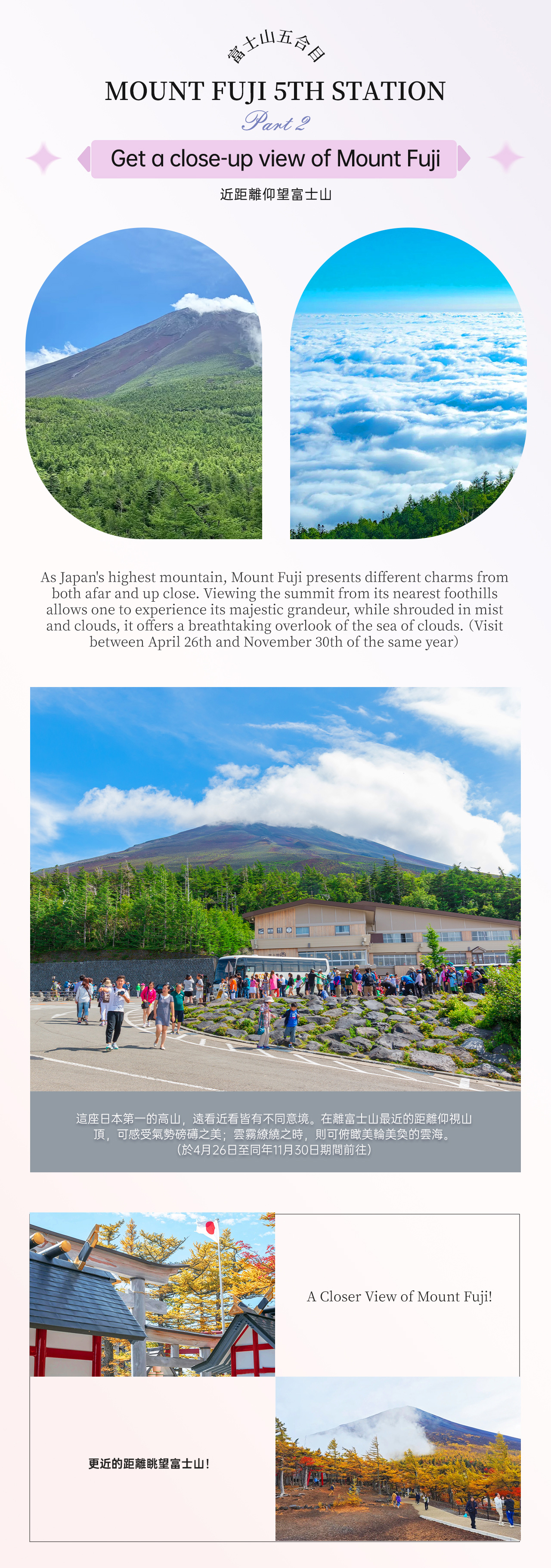 - * 依季节前往富士山五合目或新仓山浅间公园,近距离欣赏不同视角的富士山之美