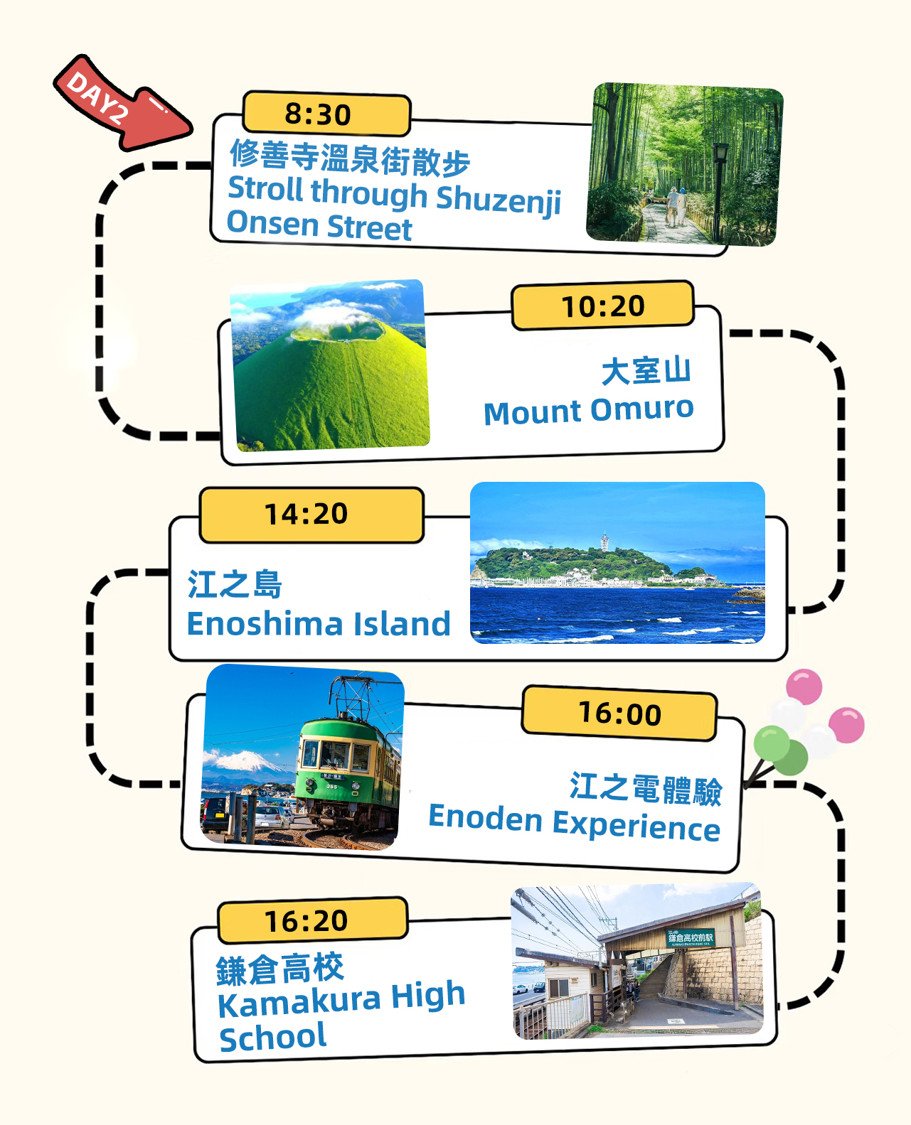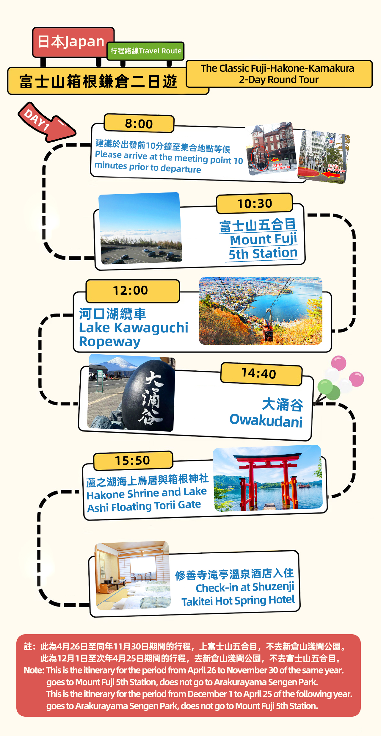 各位贵宾大家好,以下为当天的参考行程(请注意,导游可能会根据当天的实际情况进行行程顺序的调整或删减部分景点的停留时间,希望您理解!) 行前通知:在出行前一天的晚上,大约在20:00到21:00之间,我们将通过邮件为您发送详细的导游和车辆信息,请您务必及时查看。有时候邮件可能会被误分类到垃圾箱,请留意检查。在旅游旺季,邮件的发送时间可能会稍有延迟,希望您能谅解这一点。如果因特殊情况您收到了多封邮件,请以最后一封为准。 感谢您的理解和配合! 富士山五合目 时间:4月26日至11月30日 富士山五合目位于富士山的半山腰,海拔2305米。这里是观赏富士山的最佳位置,晴天时可俯瞰河口湖和周围景色,云雾时则可观赏梦幻云海。 新仓山浅间公园 时间:12月1日至次年4月25日 新仓山浅间公园是观赏富士山全景的绝佳地点,特别是在春天樱花盛开时。这里的景致吸引了众多摄影师和游客。 河口湖缆车 乘坐Kachikachi山缆车,可在1075米的展望台上欣赏富士山和河口湖全景。晴天时还能看到南阿尔卑斯山。 大涌谷 大涌谷是箱根的火山口遗迹,有名的黑色温泉蛋传说可延寿7年。这里是箱根地区的著名景点。 芦之湖海上鸟居和箱根神社 芦之湖有红色的湖上鸟居,景色优美。箱根神社历史悠久,是祈求心想事成和交通安全的圣地。 修善寺温泉街 入住修善寺滝亭温泉酒店,享受温泉。修善寺温泉街以其自然美景和文化背景闻名,是散步和放松的理想之地。 大室山 大室山是伊豆高原的代表景点,形似抹茶蛋糕。夏季绿意盎然,从山顶可以看到富士山和相模湾的美景。 江之岛和江之电 江之岛有着美丽的传说和文化遗产,是镰仓和湘南地区的热门景点。乘坐江之电体验湘南海岸美景,并参观镰仓高校。
