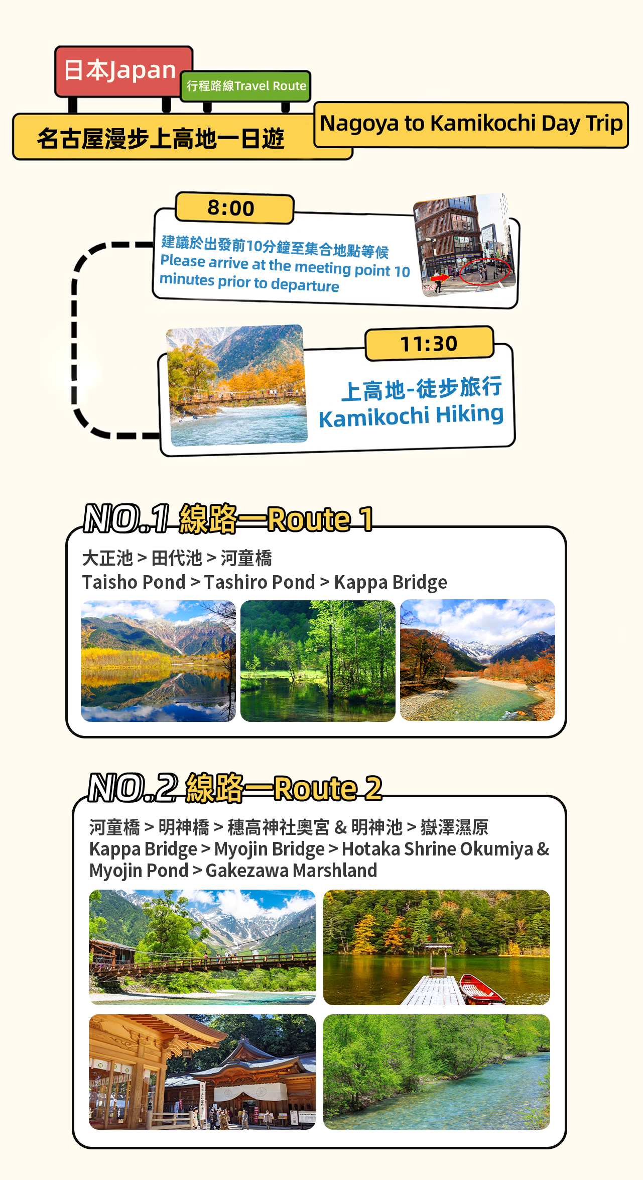 行前通知:在出行前一天的18:00到21:00之间,我们将通过邮件发送导游和车辆信息,请务必及时查看。有时候邮件被误分类到垃圾箱。在旅游旺季,邮件的发送时间可能会延迟,希望您谅解。如果因特殊情况您收到多封邮件,请以最后一封为准。 感谢理解和配合! 早上名古屋市区出发, 上高地徒步旅行 路线1:大正池 - 田代池 -河童桥 :推荐给初次游览的朋友们!这条3.5公里的路线,步行约1-1.5小时,全程平缓,沿途风景如画。从大正池的梦幻枯立木到田代池的宁静湿地,最后抵达上高地标志性河童桥,每一步都是视觉盛宴! 路线2:河童桥 - 明神桥 - 穗高神社奥宫 & 明神池** :对于有经验的徒步爱好者,这条5.6公里的路线将带你探索更深的自然之美。从河童桥出发,经过静谧的明神桥,步行至穗高神社奥宫,沿途的山岳与河岸风光,尤其是在明神池边的安静时光,让你沉浸于大自然的怀抱。 大正池:由火山喷发形成的美丽湖泊,湖中的枯立木随着季节变化展现出不同的梦幻景致,让你流连忘返! 田代池:这片浅水湿地在5月的新绿和10月的黄叶中展现了迷人的自然风光,晚秋时节的薄冰更增添了一份神秘美感。 河童桥 :作为上高地的象征,从桥上可以眺望穂高连峯、烧岳及梓川,尤其在旅游高峰期如5月长假和红叶季,吸引了大量游客。 明神池 :步行至明神池,感受穗高神社奥宫的神秘和静谧,这里是摄影爱好者的天堂,四周自然景观让人心旷神怡。 穗高连峯 & 烧岳 :穗高连峯是上高地的标志性景观,奥穗高岳更是日本的第三高峰。烧岳的烟雾缭绕更增添了山脉的神秘气息。 穗高神社奥宫 :探访穗高神社奥宫的大鸟居,体验历史悠久的“嘉门次小屋”,享受美味的岩鱼,感受浓厚的传统文化气息。 上高地的每处景点都让人感受到自然的壮丽与宁静,快来体验如世外桃源般的绝美风景吧!