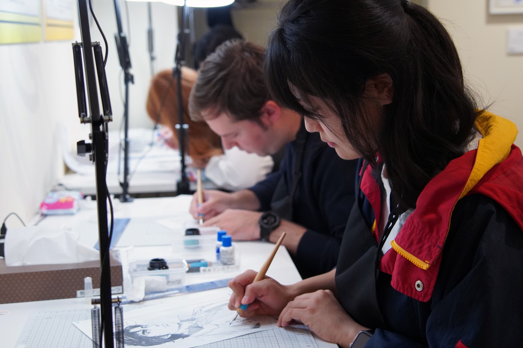 使用专业漫画家使用的「G笔」,体验在北斗神拳、城市猎人等著名作品的漫画原稿上进行笔触绘制。 **您可以用自己的手,重现那些经典场景的感动!** 完成的作品是您亲手绘制,世界上独一无二的艺术品。 为了让您随时都能回忆起那份感动,我们会将作品装入最适合的画框中交付给您。如果将其装饰在您的家中,一定能作为精美的装饰品,让您随时感受到创作的喜悦。 **可以缩时摄影记录绘制过程!** 体验的过程可以使用设置在所有座位上的摄影支架进行视频拍摄。如果使用缩时摄影,就能制作出非常适合在SNS上发布的短片。 **初学者、对绘画没有自信的人也能安心** G笔的使用方法将由工作人员亲切指导,所以请对绘画没有自信,或是第一次握G笔的人,也能安心参加。