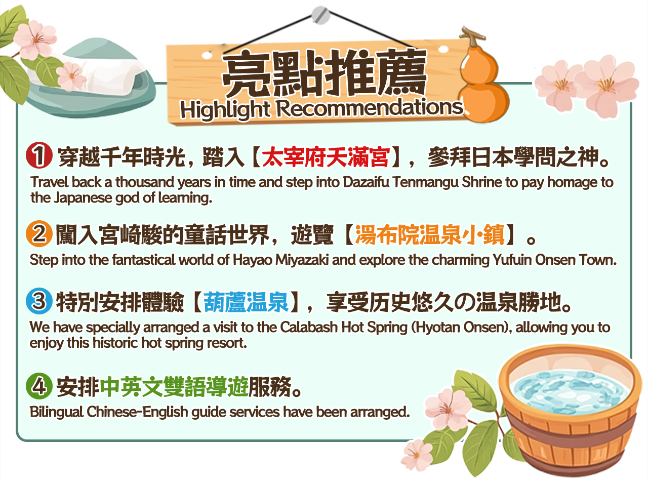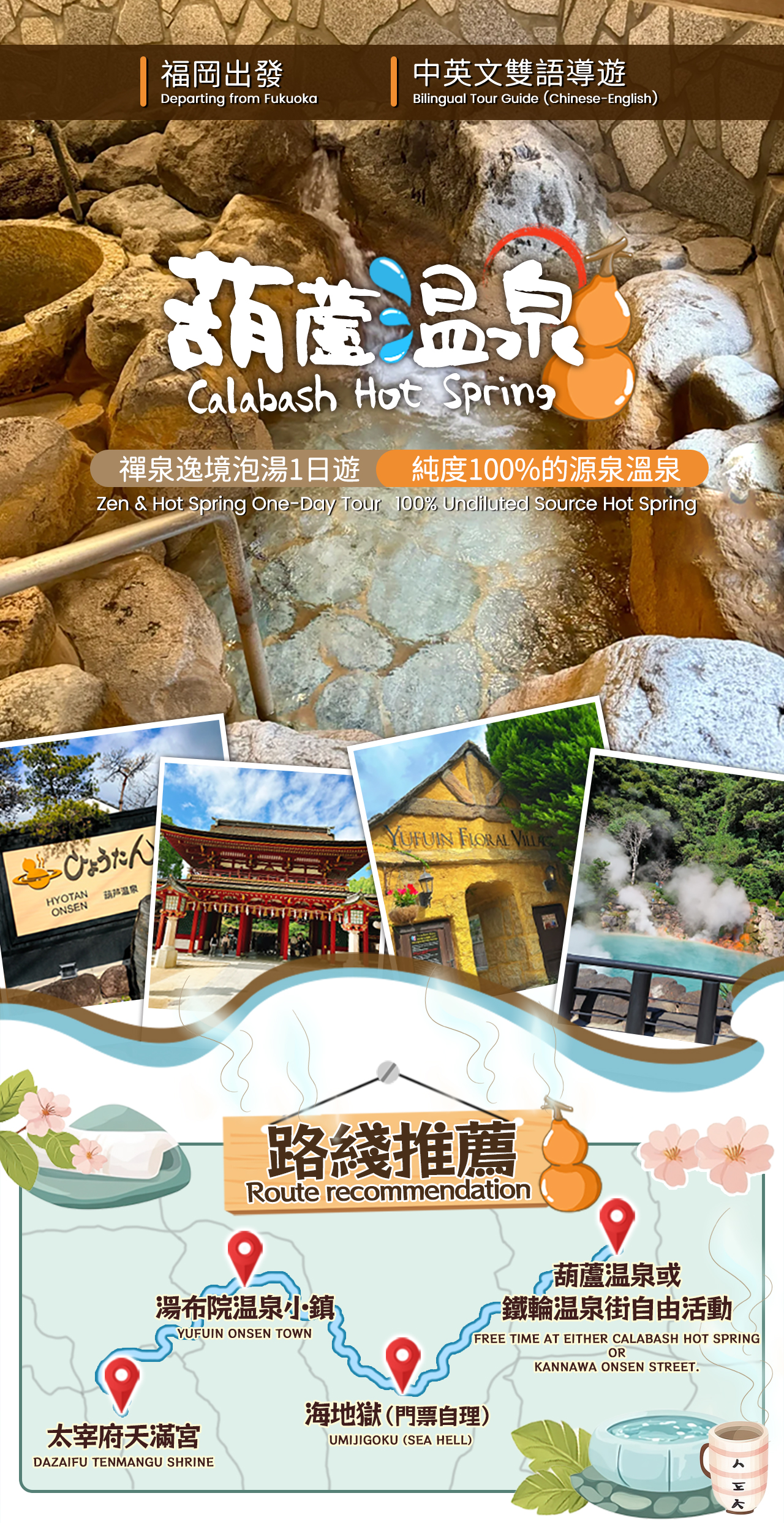 日本葫芦温泉(ひょうたん温泉)位于大分县别府市的一处知名温泉设施。创建于1922年,以附近葫芦形观景台命名,历史悠久,传承至今。以其丰富的温泉种类、独特的砂浴体验和舒适的环境,成为别府温泉之旅的热门选择,适合追求高品质温泉体验的游客。 **线路介绍**: ①太宰府天满宫-②汤布院精灵小镇-③海地狱(门票自理)-④【米其林三星】葫芦温泉(不含温泉入汤料,纹身可进入)。 **温馨提示:** 1.泡温泉是一种放松身心的方式,请需根据自身身体状况合理进行体验。