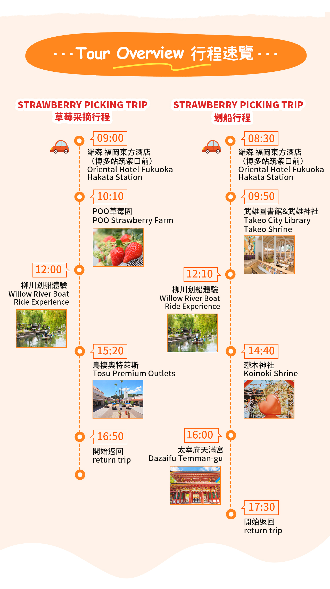 # 这是一组将自然风景、人文历史与在地生活巧妙串联,从城市出发,逐步走入九州独有的浪漫与烟火气的行程。 * 清晨在博多集合,踏上轻快旅途,从城市出发,逐步走入九州独有的浪漫与烟火气。 {**草莓采摘行程