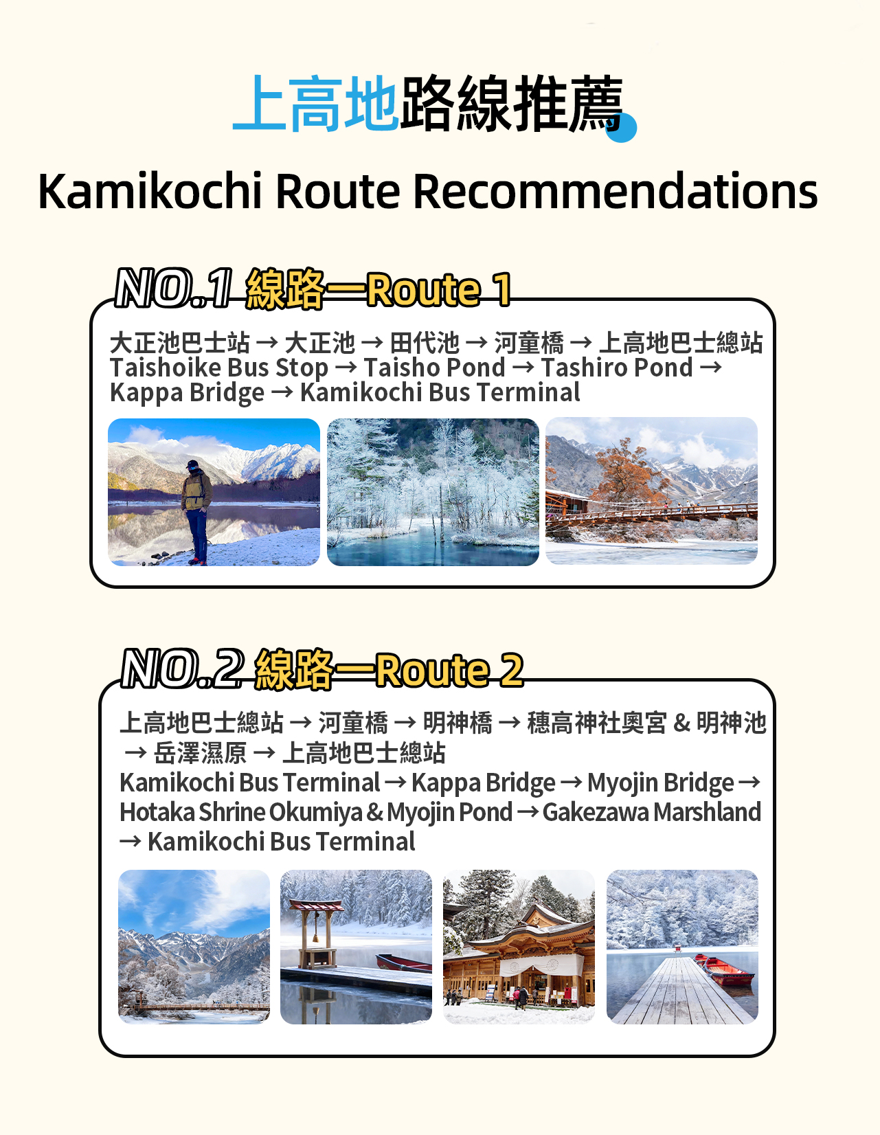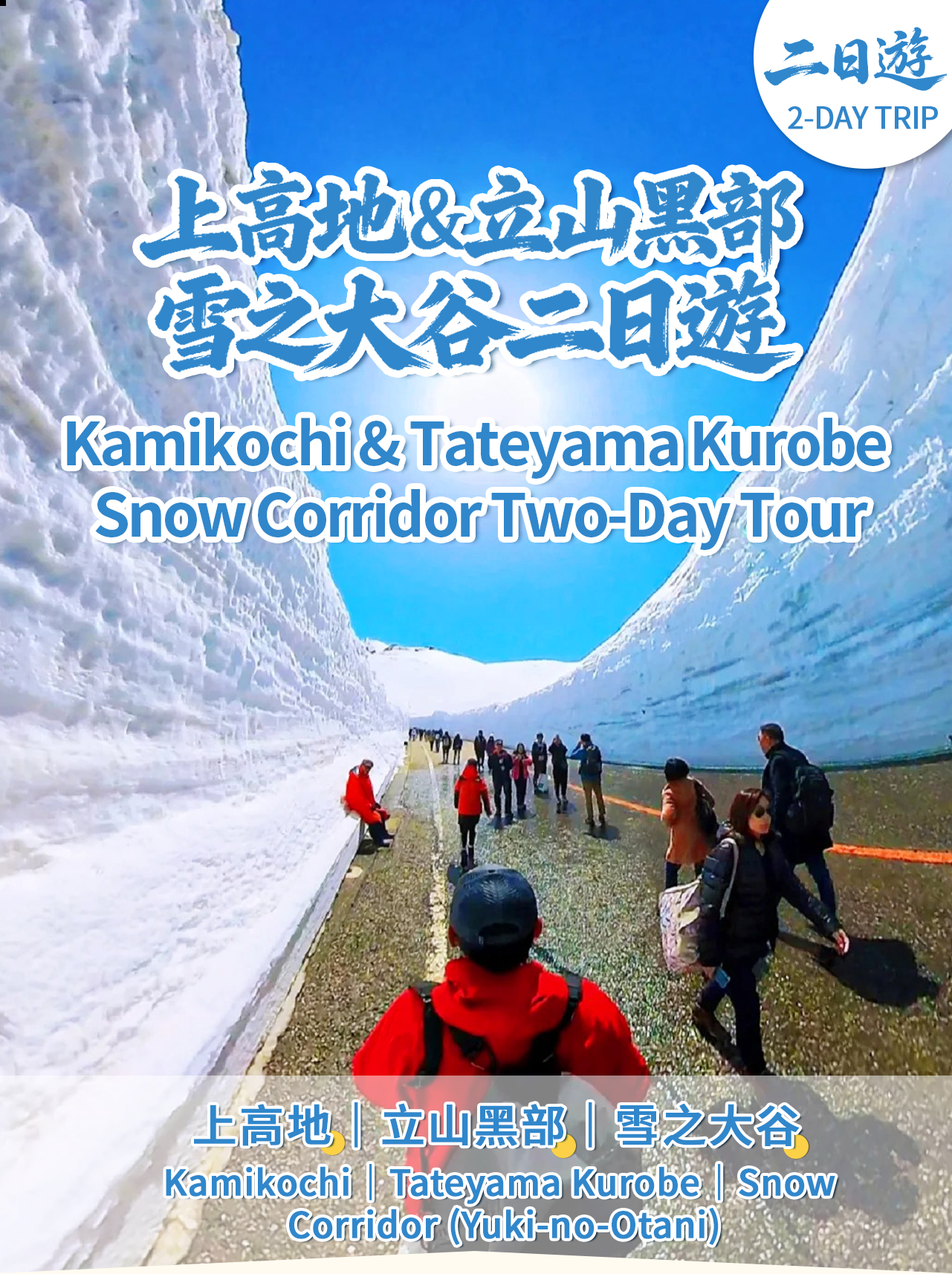 出行前通知:在出行前一天,大约在18:00到21:00之间,我们将通过邮件发送详细的导游和车辆信息,请您务必及时查看。邮件可能会被误分类到垃圾箱,请留意检查。如果因特殊情况您收到了多封邮件,请以最后一封为准。 感谢理解和配合! - **需要现场向导游购买立山交通票:10900日币/成人,5400日币/儿童6-11岁** * ✨我们将在2天内前往上高地和立山黑部阿尔卑斯山路线,第一天在“神的故乡”的上高地感受宁静与秀美。第二天穿越震撼的立山黑部高山,通过多样化的交通工具,直达云端之上的室堂,感受日本屋脊的磅礴气势。✨ * **第一天:上高地漫步** * **上高地**被誉为“神的庭院”它以其未经雕琢的自然美景、清澈见底的梓川、原始森林、火山湖泊和巍峨雪峰构成的如画风光闻名于世,是日本最具代表性和最受欢迎的山岳风景区之一。 推荐线路: 路线① :大正池巴士站 → 大正池 →田代池 →河童桥 → 上高地巴士站 路线②:上高地巴士站 → 河童桥 →岳泽湿原 →明神桥 →穗高神社奥宫 & 明神池 →上高地巴士站 * **住宿:白馬サンバレーホテル(白马太阳谷酒店)** * **第二天:搭乘6种公共交通穿越部分立山黑部阿尔卑斯山路线** 扇泽→黑部水库(关电隧道电动巴士)→黑部湖(健行)→黑部平(黑部登山缆车)→大观峰(立山空中缆车)→室堂(立山隧道巴士)→天狗平→弥陀之原→美女平(高原巴士) **立山黑部阿尔卑斯山路线**—是日本乃至全球最著名、最具特色的高山观光路线之一。它横贯日本北阿尔卑斯山脉(飞驒山脉),连接富山县的立山站和长野县的扇泽站。 * ✨从清流潺潺的上高地秘境,到白雪皑皑的立山室堂之巅!搭乘多样交通工具,穿越四季,感受日本屋脊的呼吸!快来加入我们吧!✨