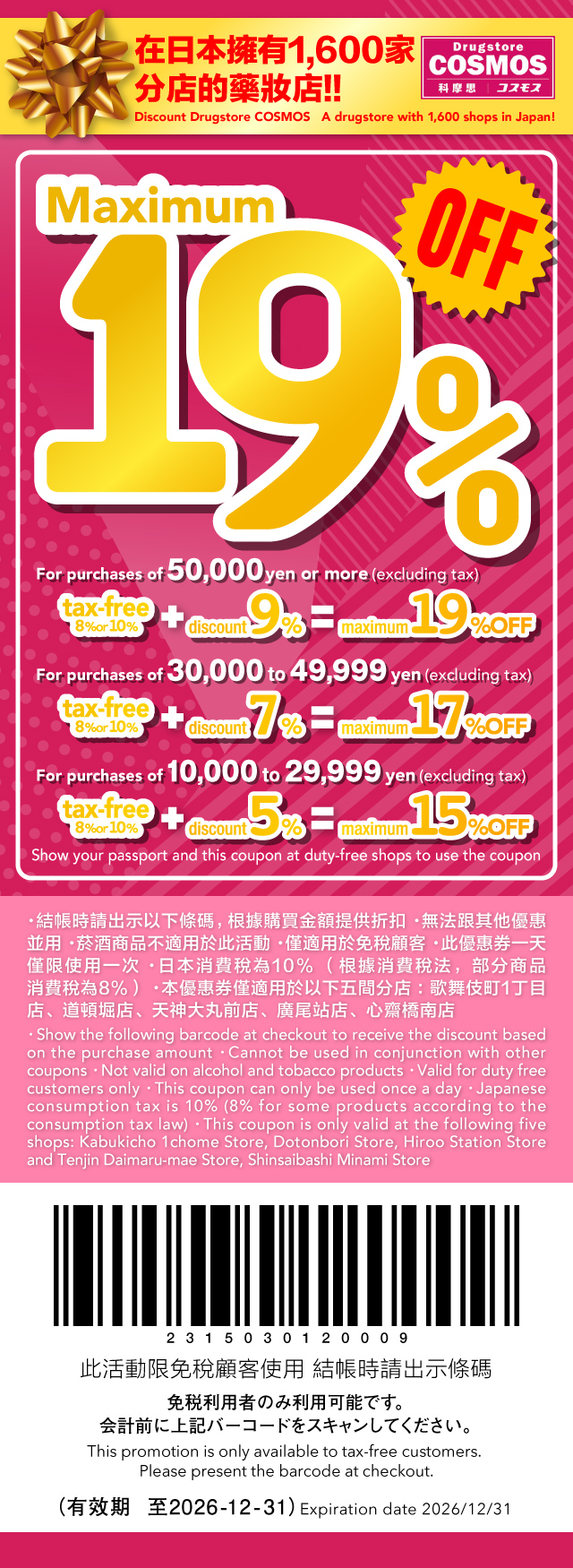 Discount DrugStore COSMOS 成立于 1983 年,是中国、四国和九州地区日本最大的药房。它以低廉的价格提供种类繁多的药品、保健食品、化妆品、日用品、食品和其他卫生用品,每天约有20,000种商品可供顾客选择。在这里,您不仅可以享受免税体验,还可以享受购物满 10,000 日元或以上的 5% 或 7% 的折扣。享受优惠券折扣,在您的旅行中成为Dsicount DrugStore COSMOS的完美购物体验之一