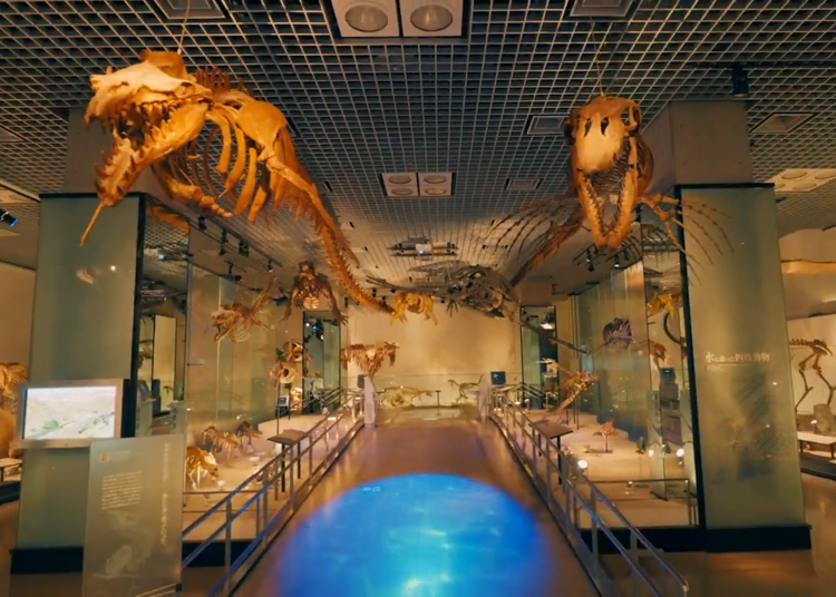 3楼展出的巨大双叶铃木龙复原骨架,可谓震撼。作为恐龙时代海洋的霸主,这种生物的威严与气势令人叹为观止。此外,日本最大规模的菊石收藏、矿物收藏,以及曾落在日本的陨石也在此展出。