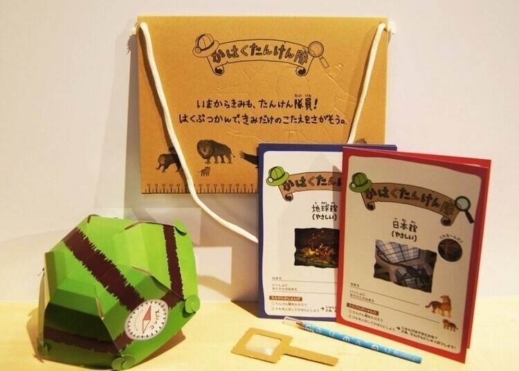 项目包含一套探险包,内有日本馆与地球馆各一册的工作表、纸质探险帽、原创铅笔等道具,售价410日元。工作表可选择“简单”或“挑战”难度,如果想尝试不同难度,也可单独购买工作表(2册250日元)。请在语音导览柜台的专用售票机购买门票,并兑换上述套装。仅接受现金支付。仅有日本语版。※不提供工作人员讲解。